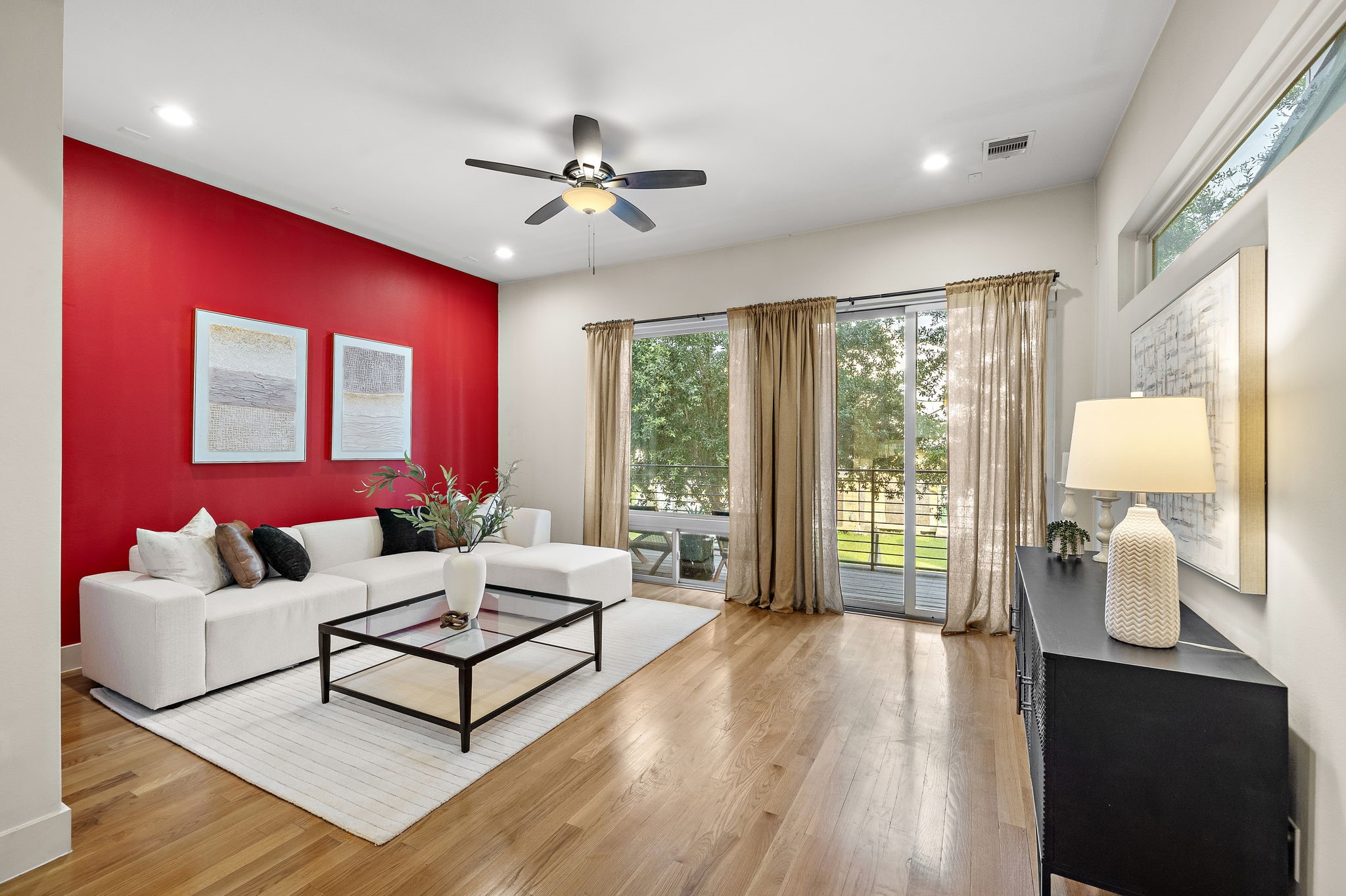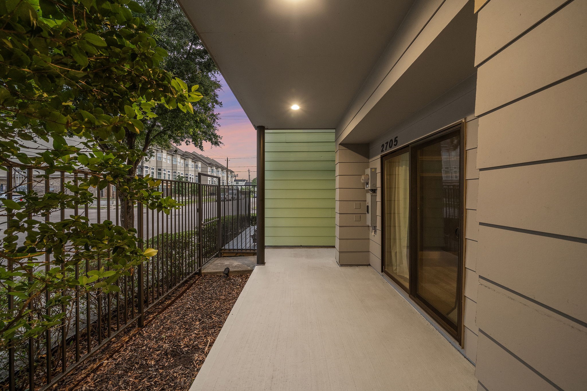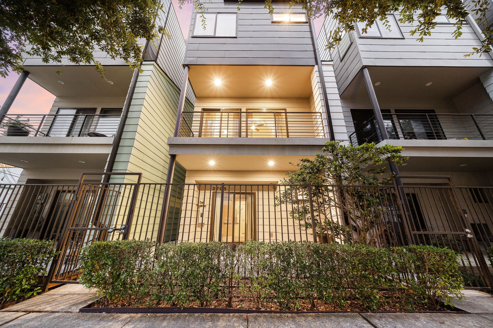 Experience sleek city living w/downtown views in this contemporary 3-bed, 3.1-bath home located in a private gated community. Designed for a lock & leave lifestyle, this residence features low-maintenance grounds, abundant natural light, hardwood floors & a spacious open layout w/private balcony access. The living area flows seamlessly into a chef-inspired kitchen, offering a gas range, modern backsplash, kitchen island & direct balcony access for outdoor dining or morning coffee. Upstairs, the primary suite includes an expansive walk-in closet & an ensuite bath w/a glass-enclosed shower & soaking tub. Secondary bedrooms each offer their own bath, adding privacy & comfort. The showstopper is a rooftop terrace w/spectacular downtown views, ideal for entertaining or relaxing. A 2-car garage, nearby community center, park, sports courts & dog park add convenience. Enjoy easy commutes via quick access to Downtown & Medical Center & proximity to top Inner Loop spots.