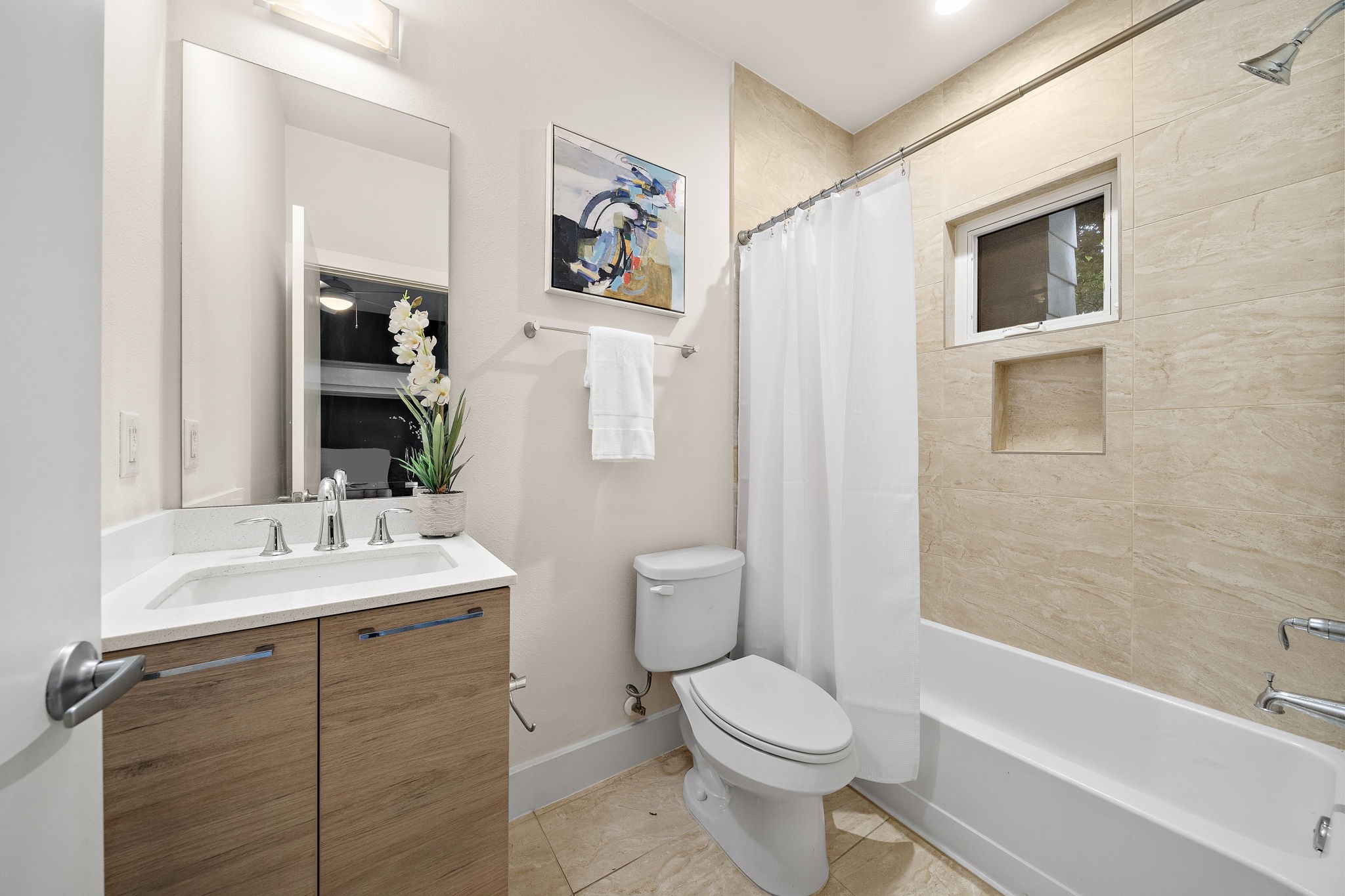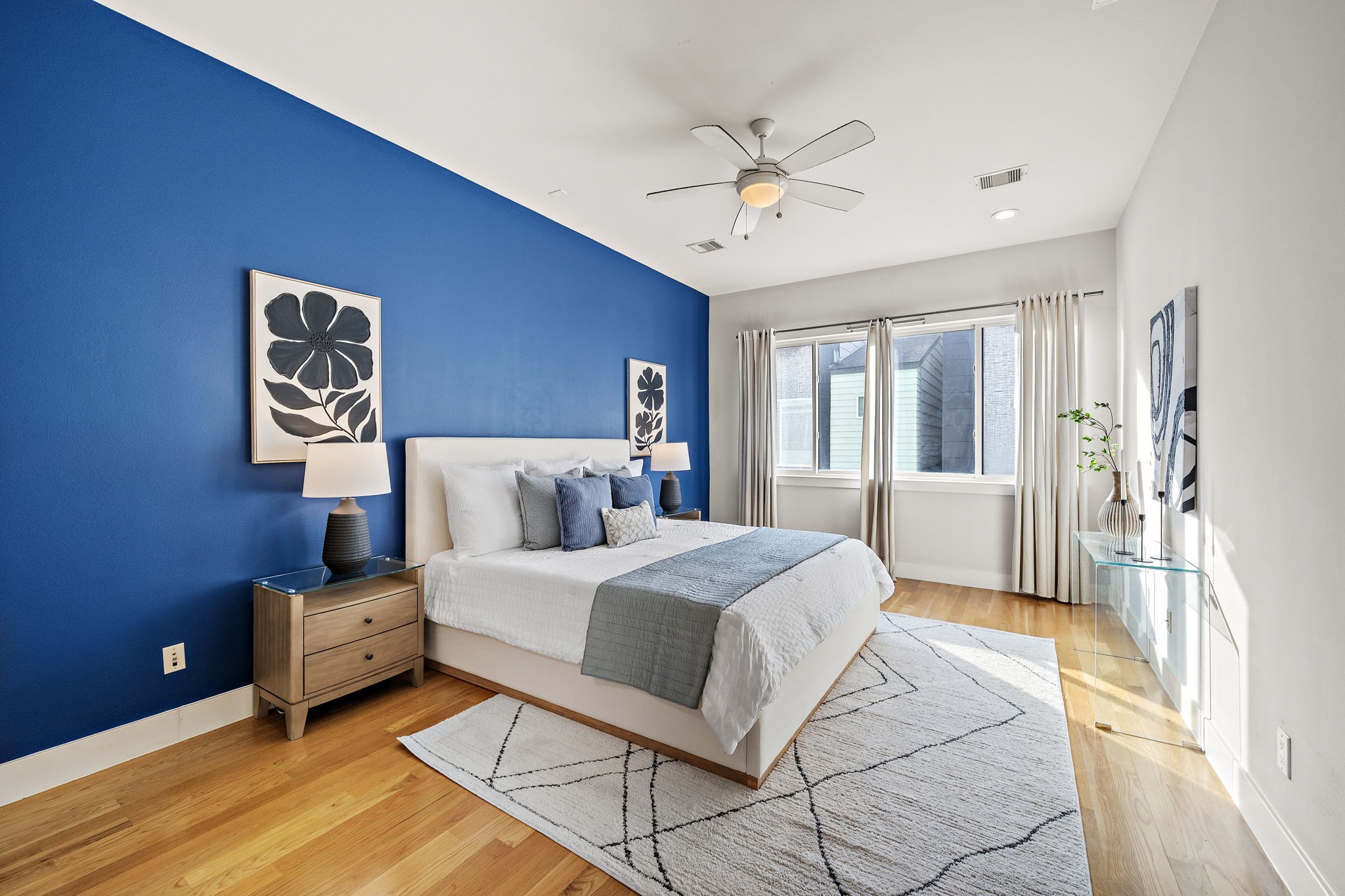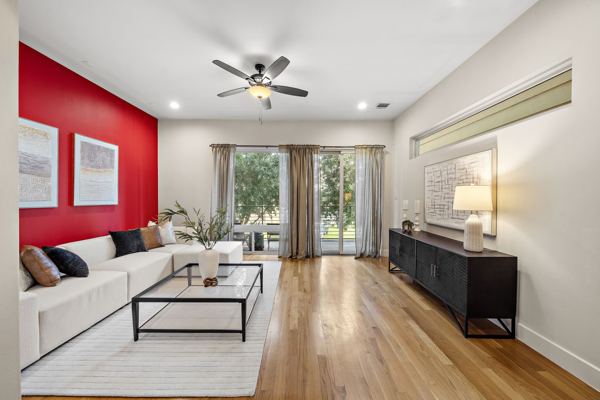 Experience sleek city living w/downtown views in this contemporary 3-bed, 3.1-bath home located in a private gated community. Designed for a lock & leave lifestyle, this residence features low-maintenance grounds, abundant natural light, hardwood floors & a spacious open layout w/private balcony access. The living area flows seamlessly into a chef-inspired kitchen, offering a gas range, modern backsplash, kitchen island & direct balcony access for outdoor dining or morning coffee. Upstairs, the primary suite includes an expansive walk-in closet & an ensuite bath w/a glass-enclosed shower & soaking tub. Secondary bedrooms each offer their own bath, adding privacy & comfort. The showstopper is a rooftop terrace w/spectacular downtown views, ideal for entertaining or relaxing. A 2-car garage, nearby community center, park, sports courts & dog park add convenience. Enjoy easy commutes via quick access to Downtown & Medical Center & proximity to top Inner Loop spots.