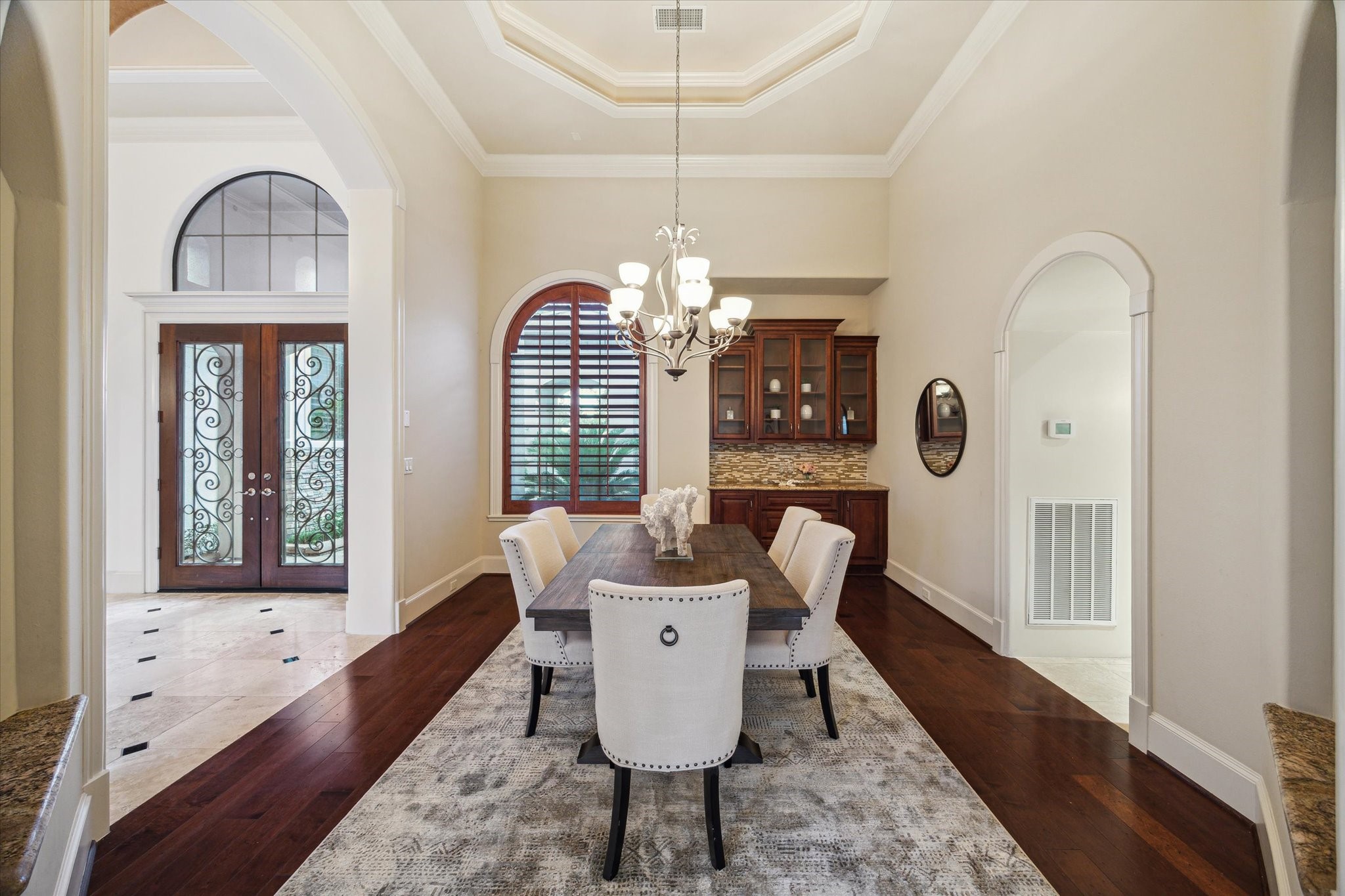 Magnificent Mediterranean custom-built residence in the exclusive gated community of Lakes on Eldridge North. This one-of-a-kind home features soaring cathedral ceilings, a luxurious grand formal living room, formal dining, an open-concept family room and gourmet kitchen, plus a private executive office. Designed for elegant living, the custom layout enhances natural light and offers seamless indoor-outdoor flowperfect for both relaxation and entertaining. The home offers four bedrooms, including a spacious primary suite and a sought-after secondary en-suite bedroom on the main floor. Upstairs are two additional bedrooms, a media room with murphy bed a refreshment bar, and a game room with direct balcony access overlooking the beautifully landscaped backyard and glistening pool. Outdoor living is elevated with a covered veranda and a fully equipped summer kitchenideal for luxurious entertaining. A truly exceptional property in a premier location.