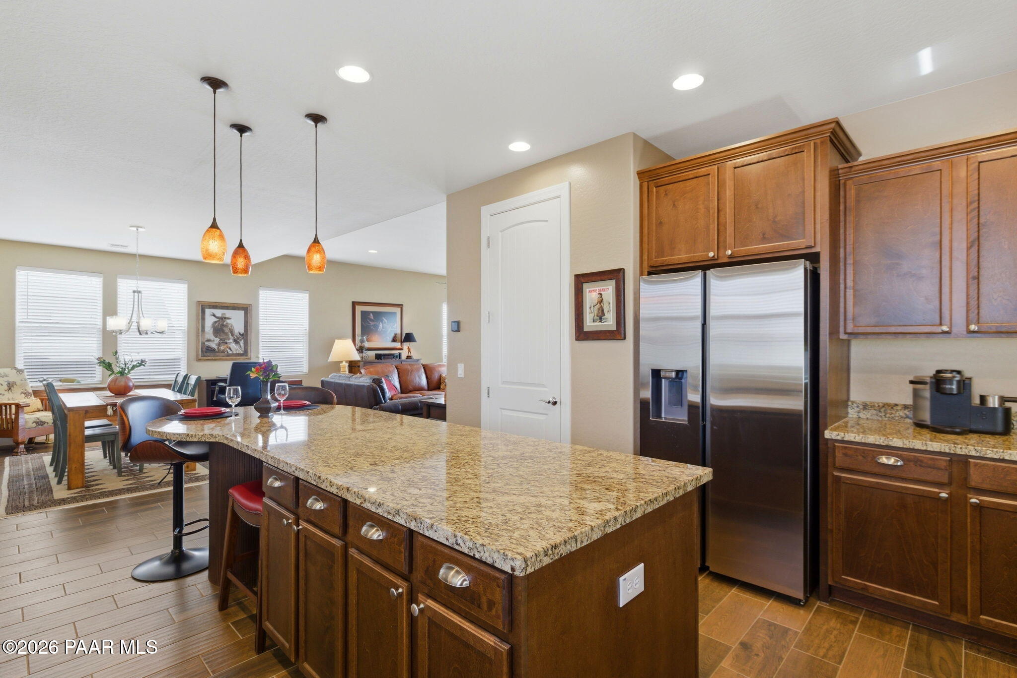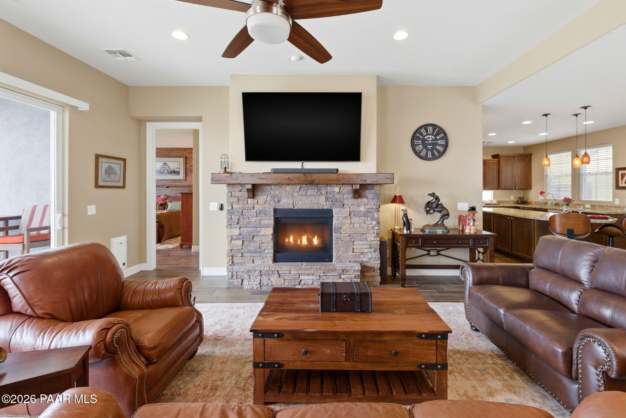 Located in the gated Prescott Lakes community, this beautifully maintained home offers 1,943 sq ft of thoughtfully designed living space with 2 bedrooms, 2 baths, and a versatile office or den with glass French doors, providing ideal flex space.The well-appointed kitchen is designed for everyday living and entertaining with granite countertops, stainless steel appliances, a large island with seating, ample cabinetry, and a walk-in pantry.The open-concept living area features wood-look tile flooring, abundant natural light, and a stone fireplace, creating a comfortable and welcoming living space.The primary suite offers a relaxing retreat with dual vanities, a walk-in shower, and a walk-in closet.Large windows invite natural light and fresh air -open the windows to enjoy birdsong by day, or unwind beside the fireplace in the evening.The backyard offers inviting outdoor living with a covered patio, travertine stone seating area, and low-maintenance landscaping, while the garage features an epoxy floor, storage cabinets, and overhead storage.Located within the gated Astoria neighborhood of Prescott Lakes, this home offers convenient access to Watson Lake, shopping, medical facilities, and historic downtown Prescott, making it ideal for comfortable full-time living or lock-and-leave convenience.