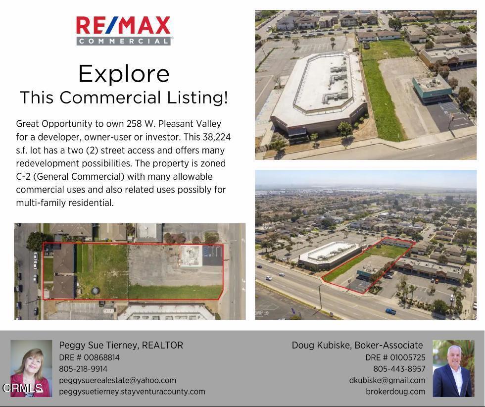 Major Price Reduction! Don't miss this price change opportunity to own 258 W. Pleasant Valley for a developer, owner-user or investor. **This 38,224 s.f. lot has a two (2) street access and offers many redevelopment possibilities. **Zoned C-2 (General Commercial) with many allowable commercial uses and also related uses possibly for multi-family residential. Buyer to check with applicable governmental authorities to determine if desired use is possible. There are three (3) buildings on the property which includes one (1) commercial restaurant building and two (2) single family homes. And all buildings are currently occupied. The commercial building at 258 W. Pleasant Valley Rd features a 1,300 s.f. restaurant. The two (2) single family homes consist of 241 Canterbury - 1,360 s.f. 3 bedroom + 2 bathrooms; and 243 Canterbury - 1,200 s.f. 4 bedrooms + 2 bathrooms. Conveniently located near Naval Base, Deepwater Port Hueneme and minutes to Highway 1 and 101 freeway and Coast. This is a great property to own and to redevelop!