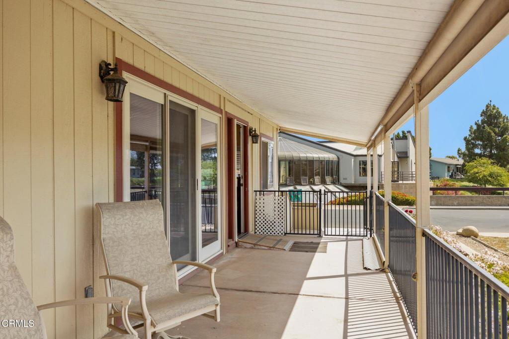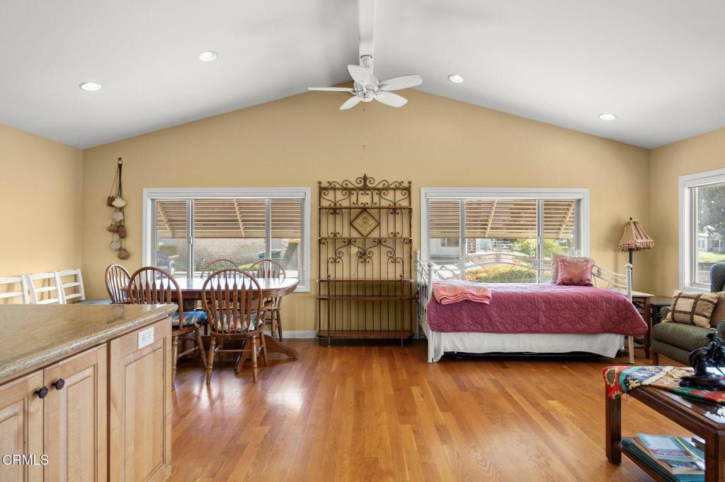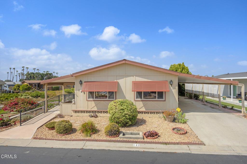 PRICE IMPROVEMENT - Welcome to Poinsettia Gardens, Ventura's premiere, over 55 community where you own the land and pay low monthly HOA dues of $357. One of the best locations within the community as the Clubhouse, pool, spa is directly across the street and views of the pond from the front patio- yes, it's a waterfront home. This updated home includes an open floorplan with kitchen offering warm honey oak cabinets, granite countertops, island with sink, stainless appliances included with ascents of glass cabinet faces. The kitchen opens to the southern exposure / light and bright living room with vaulted ceilings, neutral tones, hardwood flooring throughout, slider to front porch, and more. The primary suite offers an additional bonus room perfect for home office, crafts, or workout room, walk-in closet, and in-suite bathroom. The secondary bedroom is ample in size. Carport with built-in storage room that offers additional storage space, washer and dryer included, ceiling fan, central A/C, dual pane windows, and a lot more to offer.