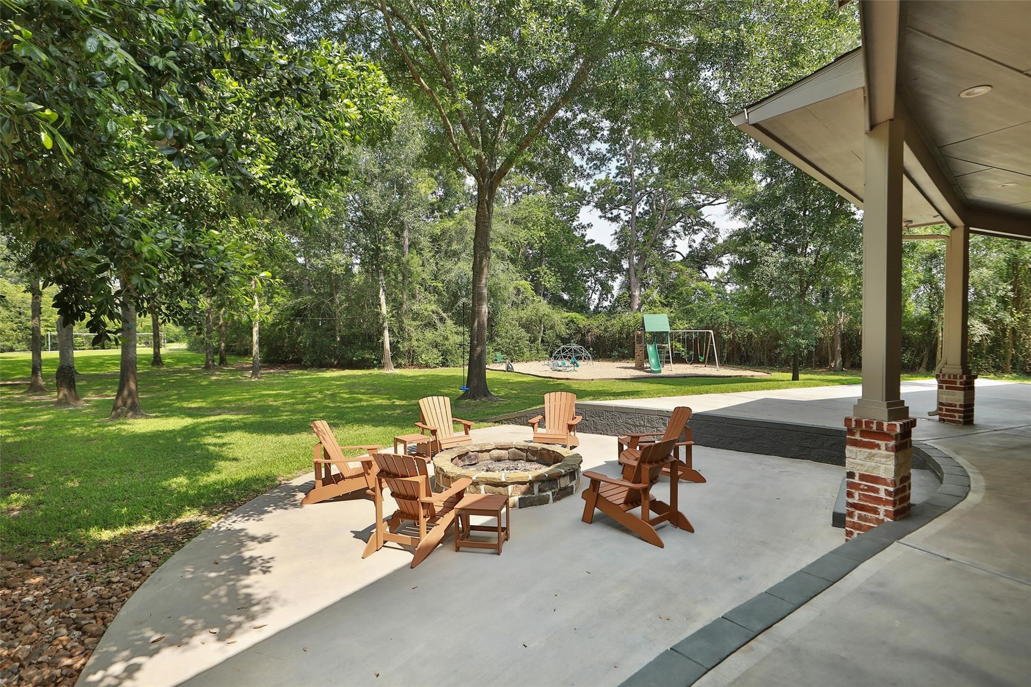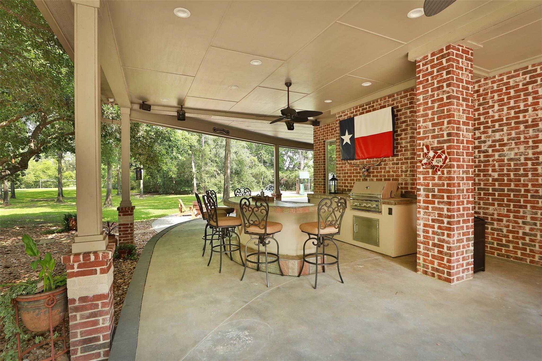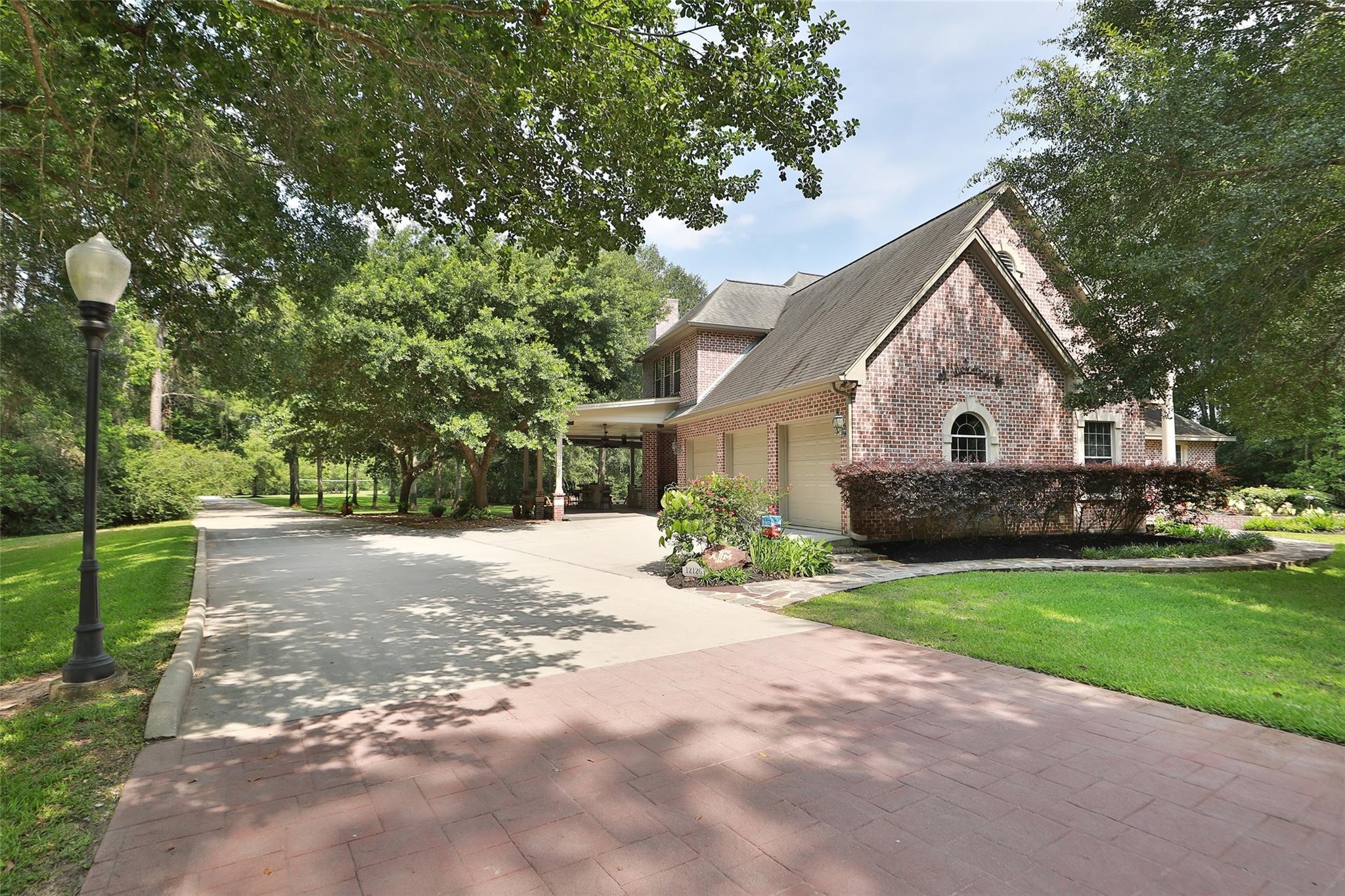 As you arrive, you enter this tranquil property through a private gate, cross over a stone bridge with three culverts allowing the pond to run under and through the bridge. The picturesque pond is stocked with Bass, Catfish, Sun Perch and Crappie. This home sits on 2.86 acres with mature oak trees, providing a haven of natural beauty. This exceptionally built custom all brick and stone home with a remodeled downstairs also has an amazing outdoor space with a firepit, plus outdoor kitchen with 2 fridges, a gas grill and tv, a hot tub all under a 2000 sf covered porch so that you can relax and take in the serene views. The backyard has Lifetime playground equipment built inside a gravel play area for the kids. The ground floor is wide open and the Lg 7'x15' kitchen island is ideal for entertaining your family and guests. The remodeled kitchen has a built-in fridge and top-of-the-line equipment.
