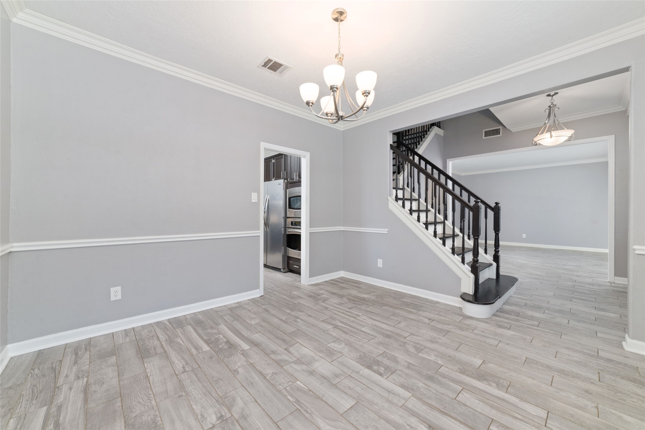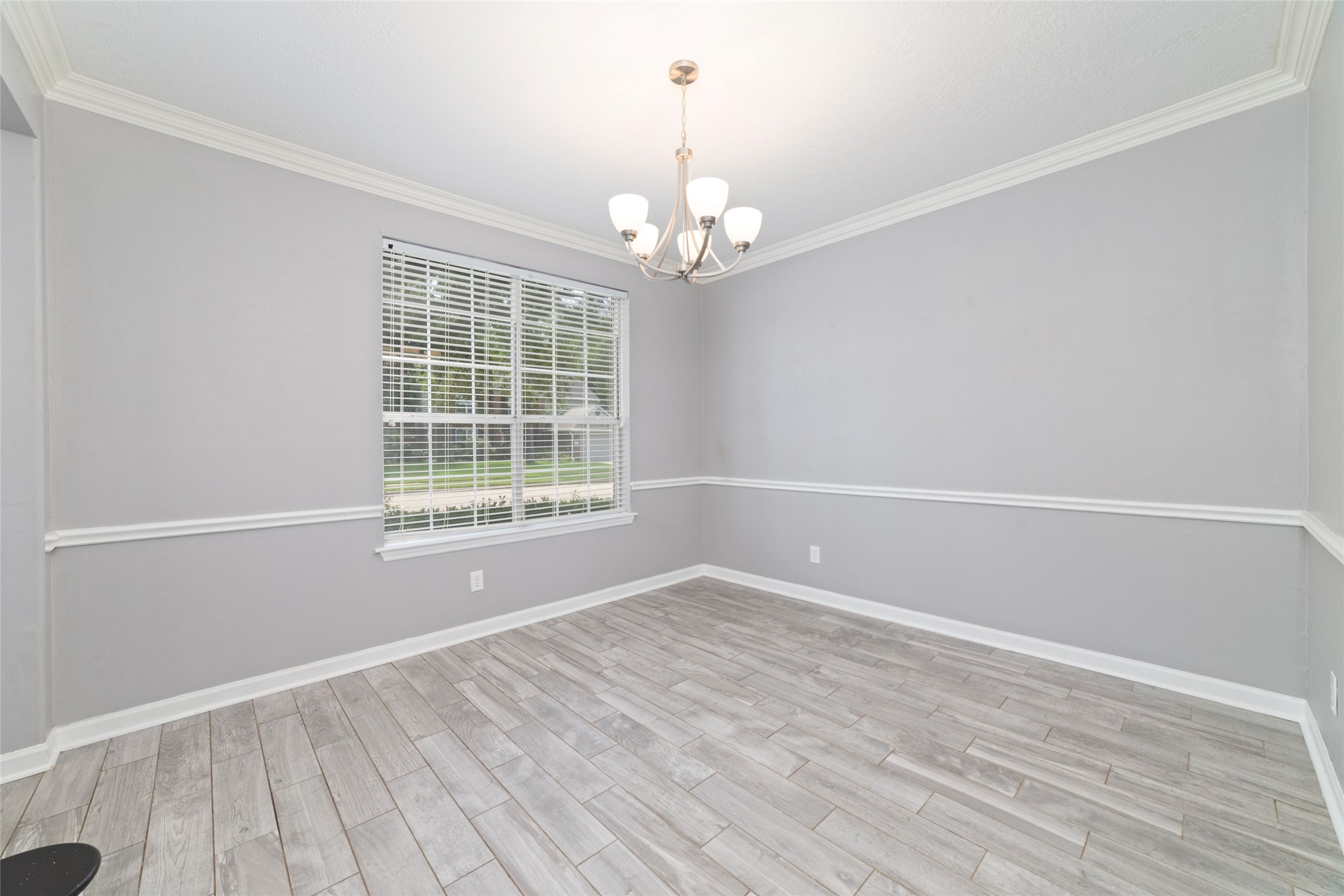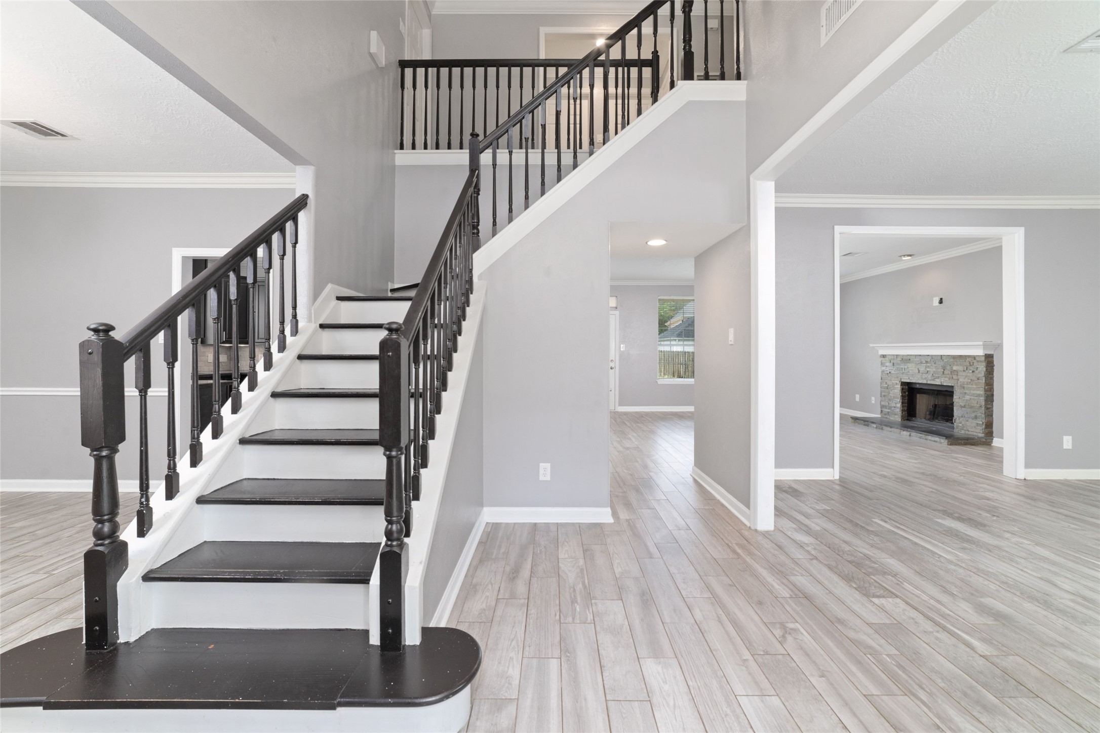 Beautiful 4 bed 2.5 bath brick home situated on a desirable corner lot. Entering you are greeted with wood look tile flooring and elegant crown molding that flows throughout the home. To the left is a formal dining room, and to the right a formal living room, perfect for entertaining. Kitchen features granite counters, stainless steel appliances, and a bright breakfast area. Living room offers a cozy gas log fireplace and plenty of natural light. Upstairs you will find all 4 beds, each with walk in closets, along with an additional flex room. Large primary suite boasts an ensuite bath with dual sinks, a Whirlpool jetted tub, separate glass shower, and two closets. Secondary bath includes double sinks and a tub shower combination. Outside to enjoy a stone patio and an oversized fully fenced backyard. 3 car garage offers versatile options, with one side ideal for an office, workshop, or golf cart storage. Wahser, Dryer, and Refirgerator included!