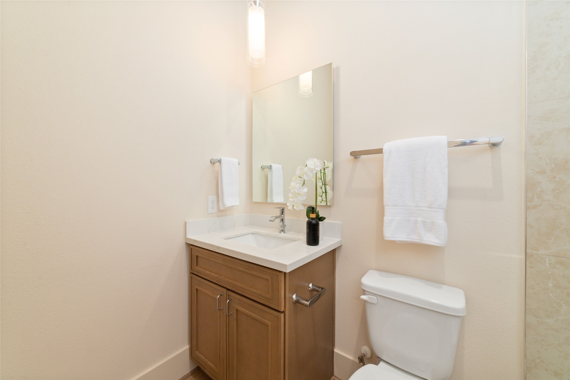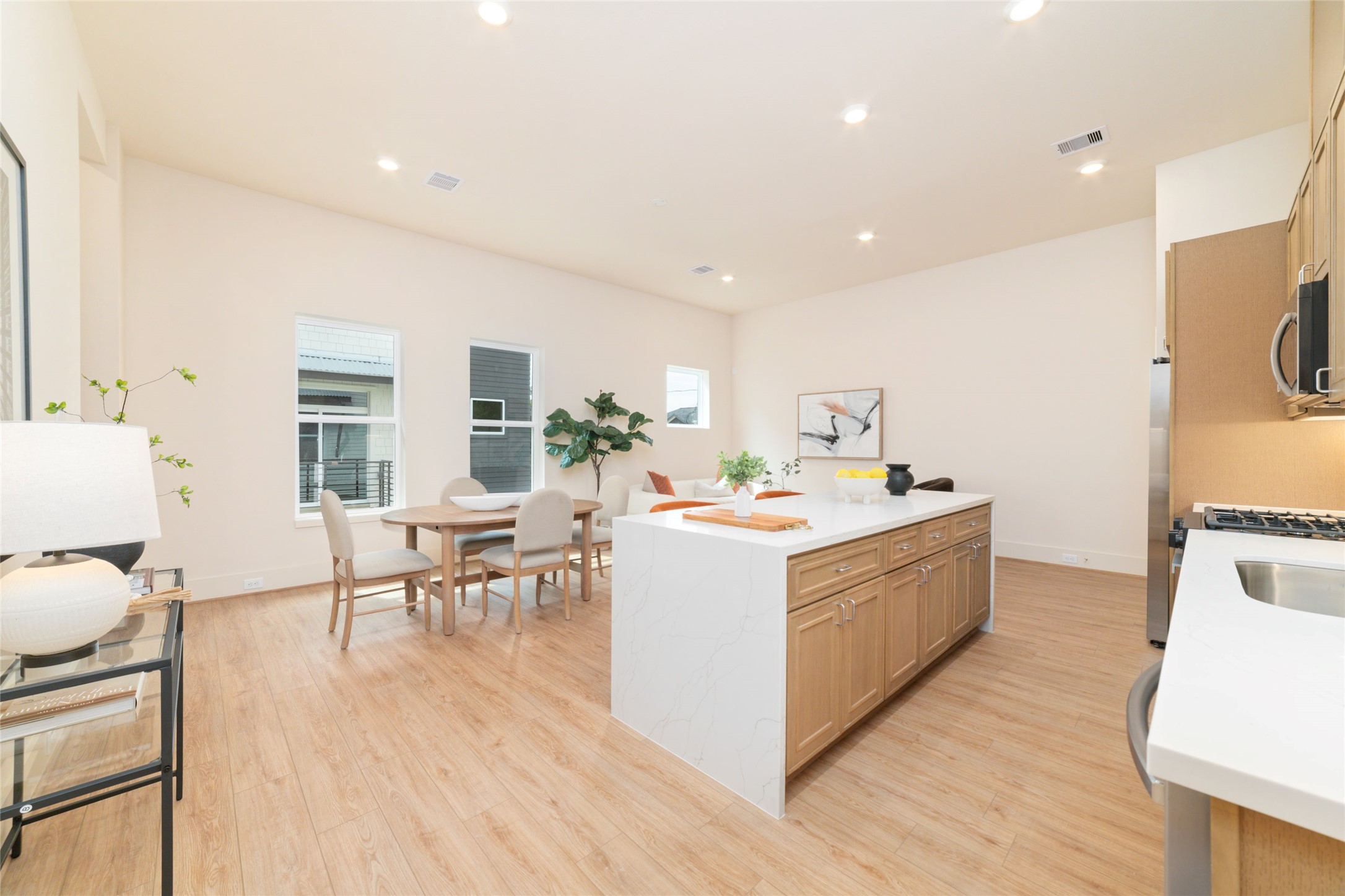 Stunning new construction 3-level home offering 3 beds and 3.5 baths, located in a private gated community. From the moment you enter, you will notice the beautiful engineered wood flooring and tall ceilings that carry throughout the home. 1st level includes a 2 car garage, 1/2 bath. 2nd level serves as the main living area and features a gorgeous kitchen with a waterfall island and breakfast bar, gas range, stainless steel appliances, quartz countertops, undermount farm sink, and under-cabinet lighting. Kitchen opens seamlessly to the combined living and dining areas. Also located on this level is a private bedroom with a full ensuite bath. 3rd level offers secondary bed with its own ensuite bath, along with the impressive primary suite. Large primary bedroom has vaulted ceilings, and a spa-inspired ensuite bath w/dual sinks, a vanity, soaking tub, glass shower, and an expansive walk-in closet. Rare highlights of this property is the private, fully fenced backyard.