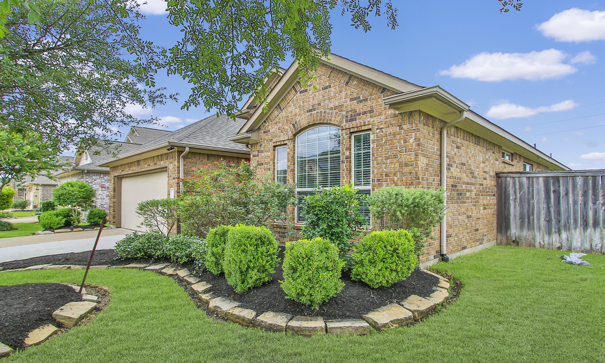 You're going to love everything about this home! Open concept floor plan makes this home perfect for entertaining & daily life. 1 story, 3 Bedroom/2 Baths, high ceilings, lg windows for added natural light, oversized lot w/ no back neighbors, & extended back patio. Owner's Retreat includes en suite with soaking tub, sep shower, His & Her sinks, xlg vanity, private water closet. Kitchen features Gas cooking, 42" upper cabinets for added storage, large island w/ breakfast bar, large breakfast room. Formal dining room space could also be used as home office, workout space, or playroom. Gas Log Fireplace w/custom mantle takes the chill off those cool Texas evenings. 3 Stage whole house water filtration system. Don't miss the custom work space. 3 Sides brick makes exterior maintenance a breeze! Community amenities include pool, splash pad, tennis/pickleball courts, lakes, and park. Highly rated schools w/ elementary school inside the neighborhood. Easy access to 290 and 99 for commuters.