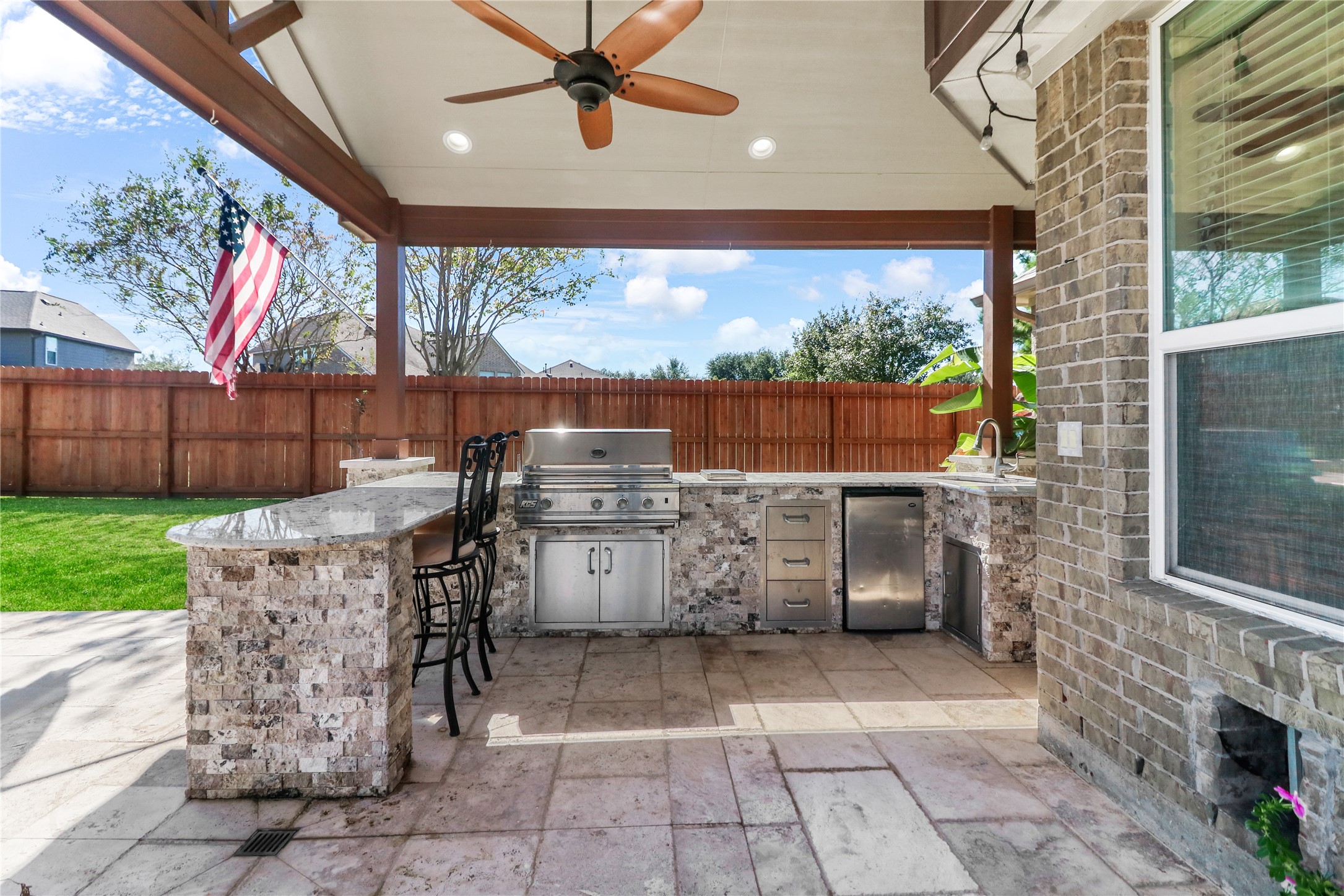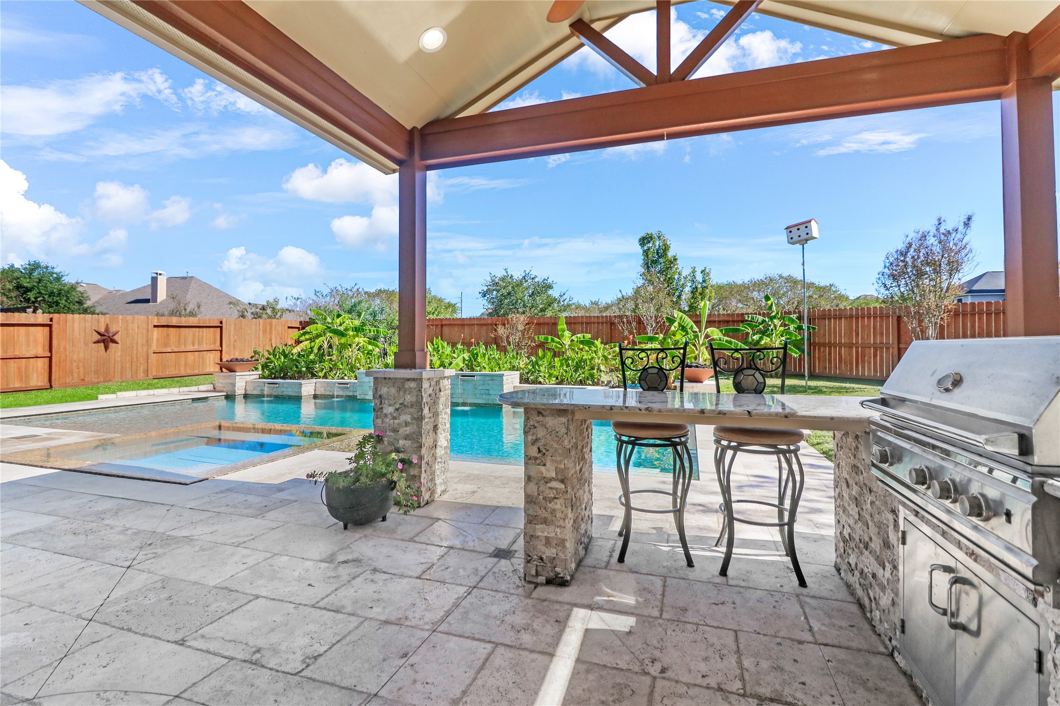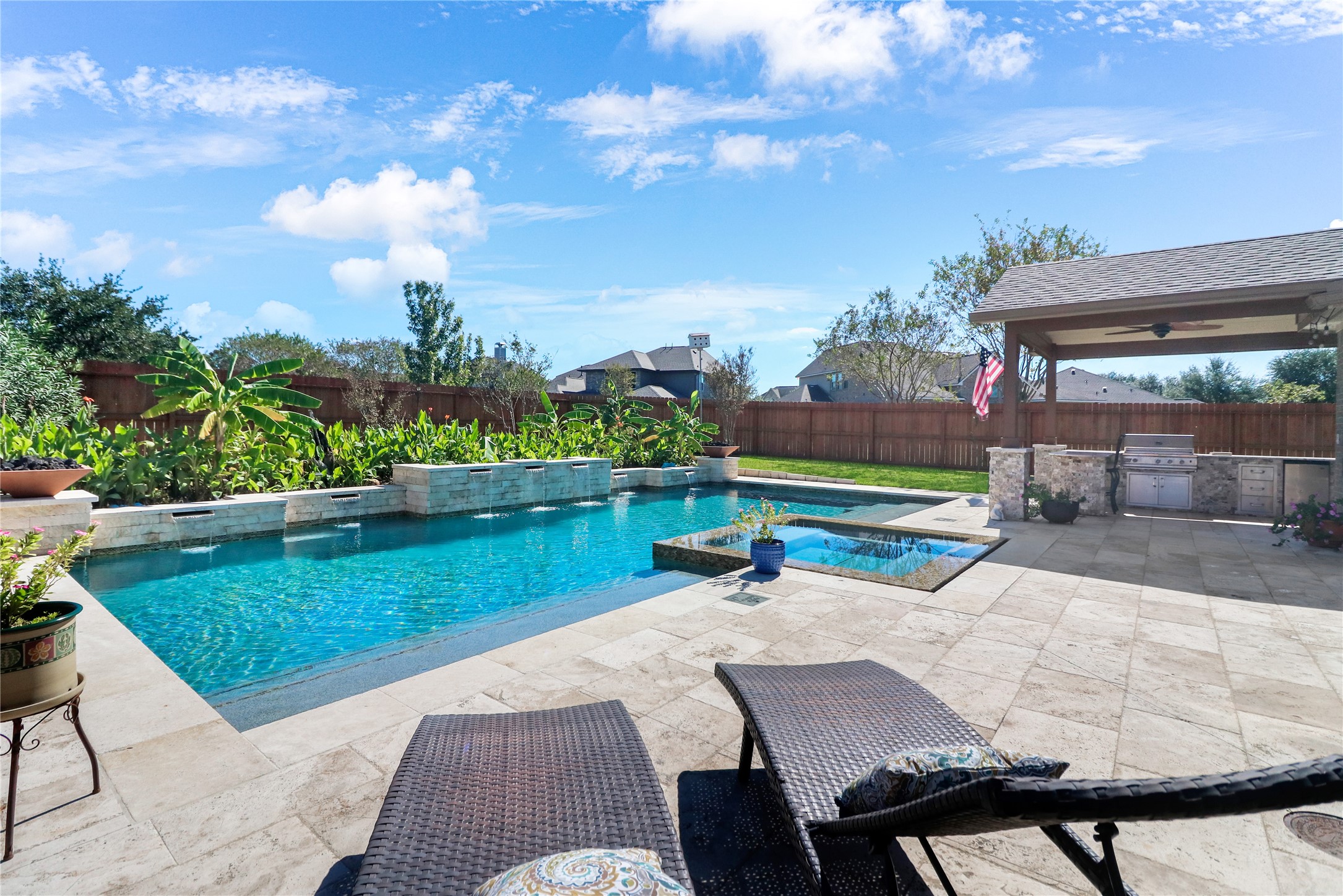 Stunning Home in the highly sought-after Treeline subdivision. The 3,462 sq ft home sits on a 10,450 sq ft lot with no backyard or side neighbors, offering privacy and plenty of green space. Enjoy resort-style outdoor living with a custom pool and spa, plus a covered patio with an outdoor kitchen—perfect for entertaining or relaxing.The primary suite includes an ensuite bath, a walk-in closet, as well as direct access to the covered patio. The home also features a home office, a formal living area, and an upstairs gameroom with three additional bedrooms and two full baths.The kitchen boasts quartz countertops, a breakfast bar, and an adjacent dining area, ideal for family gatherings. Additional highlights include a tandem 3-car garage and a prime cul-de-sac location, providing space, comfort, and privacy.This home perfectly blends luxury, functionality, and outdoor living—schedule your private showing today!