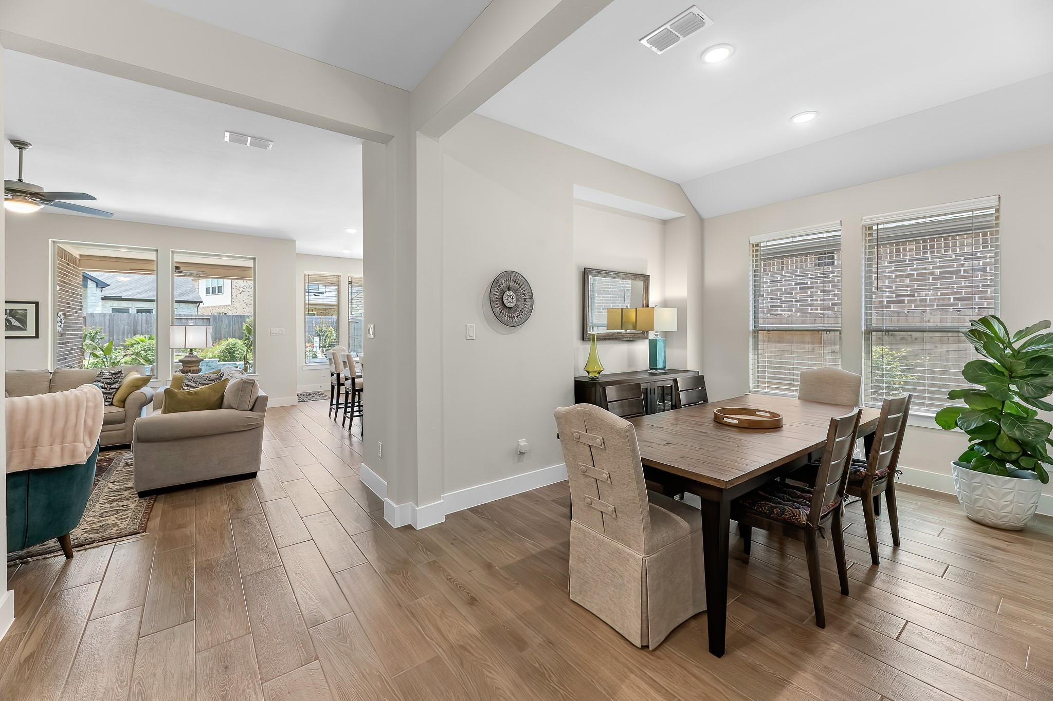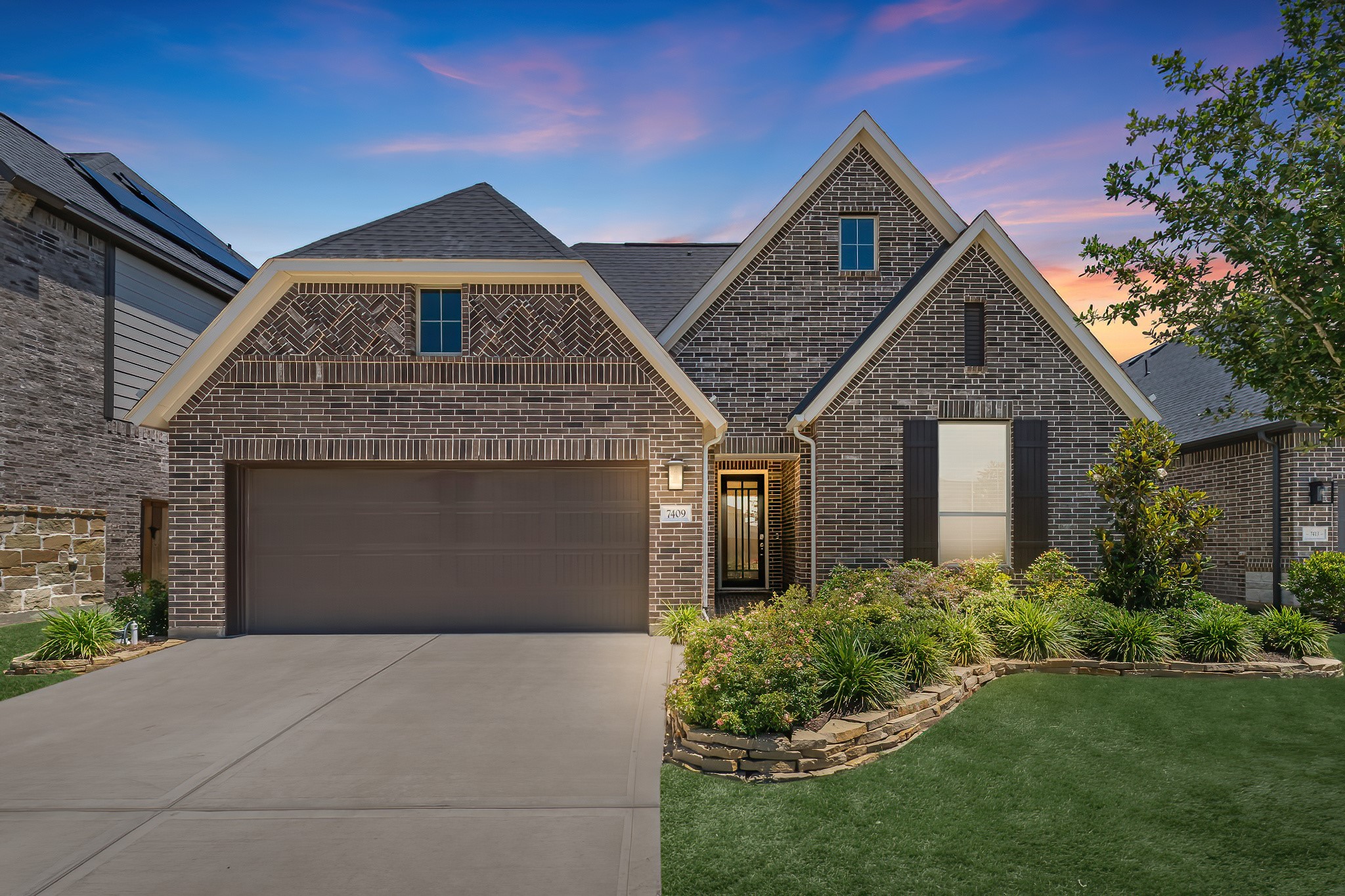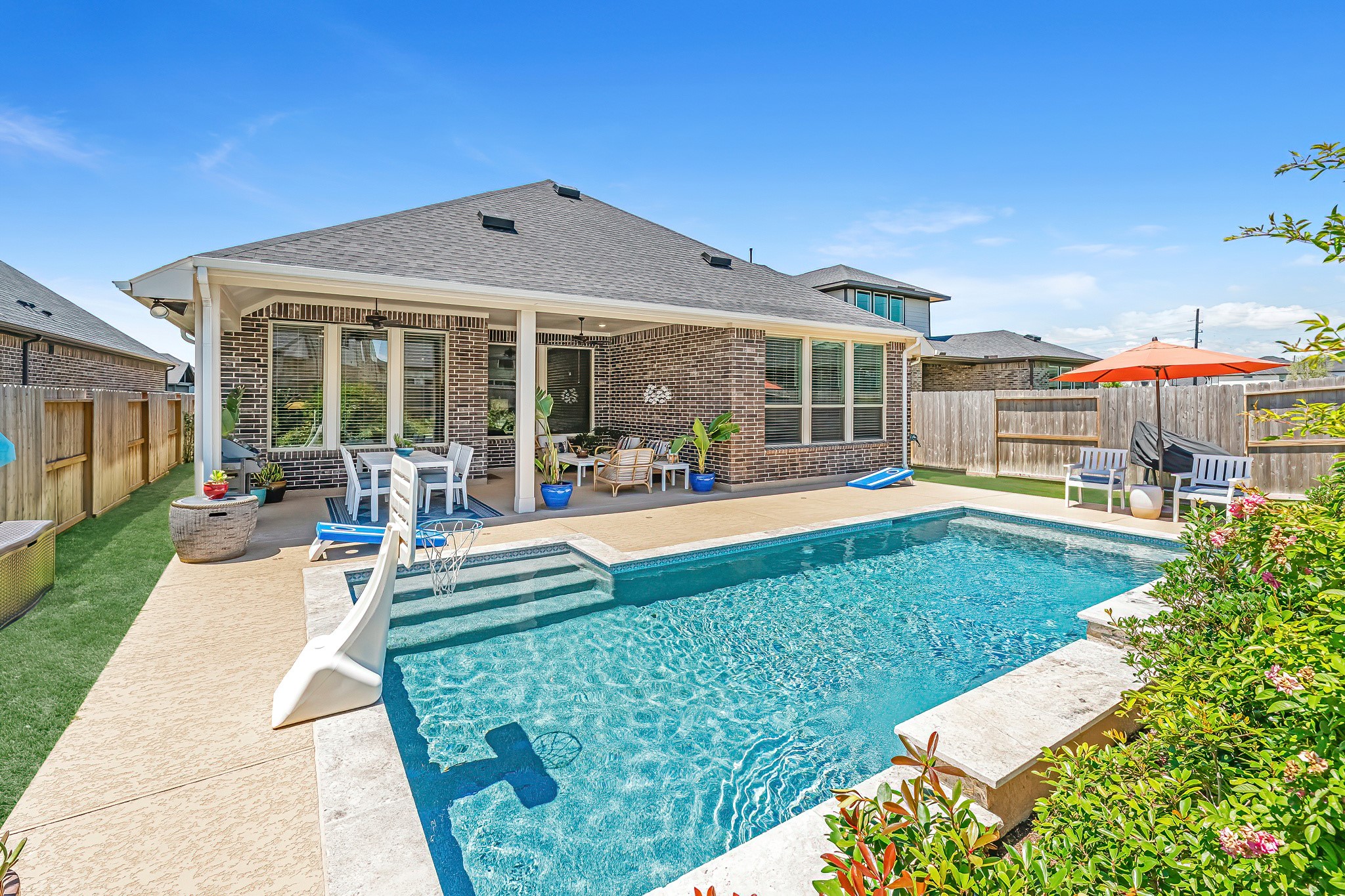 Live the resort lifestyle every day in this STUNNING 1-story home, beautifully designed with a timeless brick elevation and elevated, neutral finishes. This 3–4 bedroom, 2.5 bath gem offers an open, light-filled layout, wood-plank tile floors, soaring ceilings, and 8-ft doors. Two spacious secondary bedrooms plus a large flex room provide space for media, hobbies, or a 4th bedroom. The bright family room showcases views of your private backyard oasis with PebbleTec pool and extended covered patio—ideal for entertaining or relaxing. The gourmet kitchen features quartz counters, crisp white cabinetry, and a sunny breakfast nook. The primary suite offers a spa-inspired shower, dual sinks, and elegant Grey Wolf cabinetry. Added perks include a K5 water softener system, plus community fitness center, lakes, trails, and amenity center within walking/biking distance. Zoned to A-Rated Leaman JH + Fulshear HS and priced to sell! Get into your dream home with its dreamy pool before the holidays!