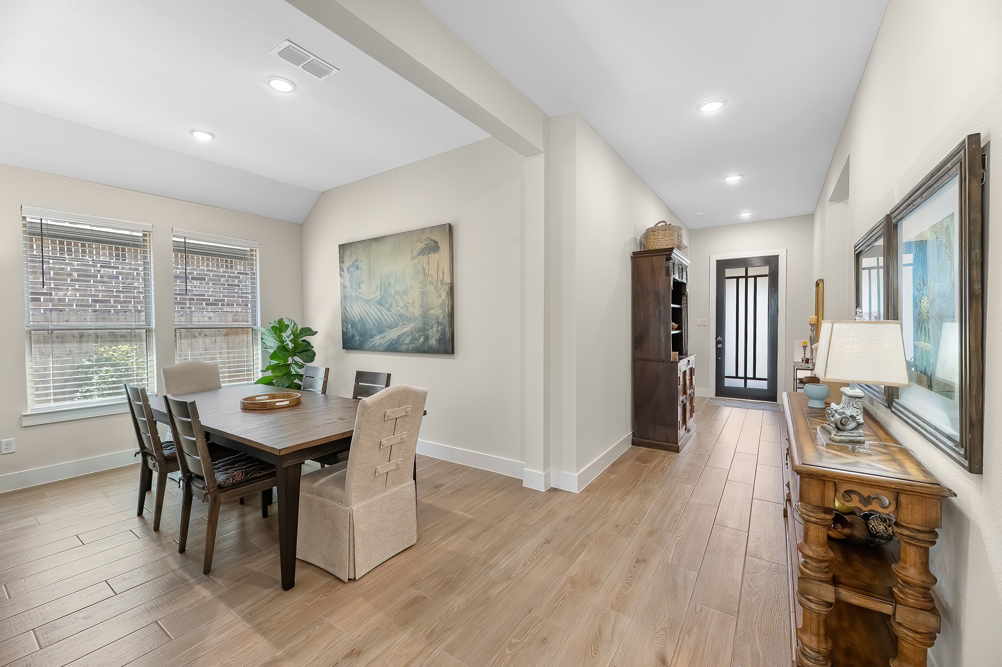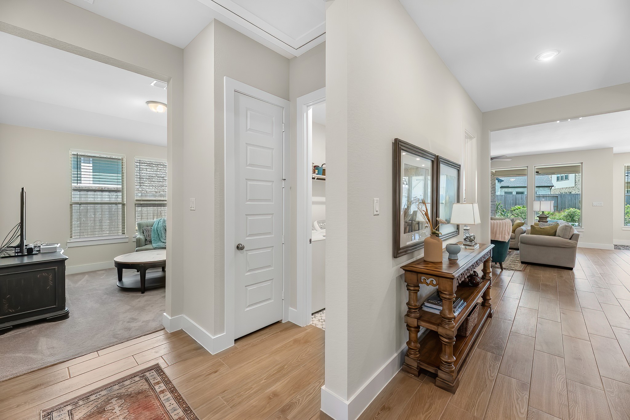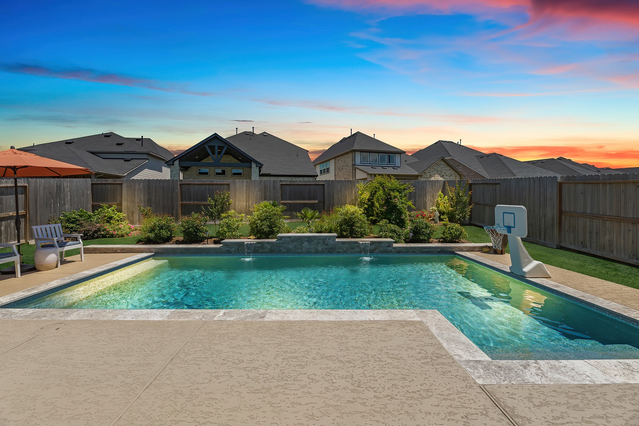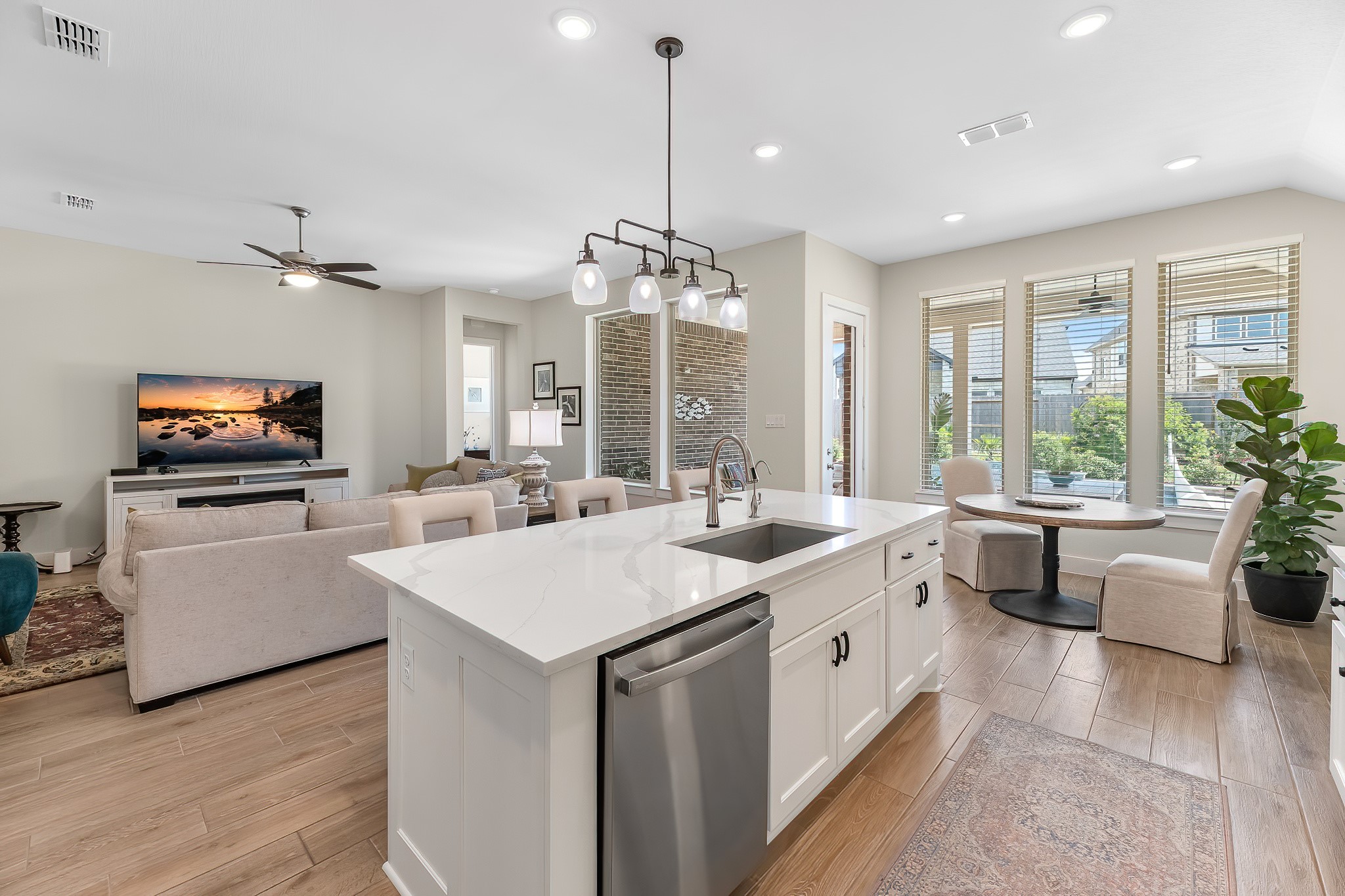 Live the resort lifestyle every day in this STUNNING 1-story home, beautifully designed with a timeless brick elevation and elevated, neutral finishes. This 3–4 bedroom, 2.5 bath gem offers an open, light-filled layout, wood-plank tile floors, soaring ceilings, and 8-ft doors. Two spacious secondary bedrooms plus a large flex room provide space for media, hobbies, or a 4th bedroom. The bright family room showcases views of your private backyard oasis with PebbleTec pool and extended covered patio—ideal for entertaining or relaxing. The gourmet kitchen features quartz counters, crisp white cabinetry, and a sunny breakfast nook. The primary suite offers a spa-inspired shower, dual sinks, and elegant Grey Wolf cabinetry. Added perks include a K5 water softener system, plus community fitness center, lakes, trails, and amenity center within walking/biking distance. Zoned to A-Rated Leaman JH + Fulshear HS and priced to sell! Get into your dream home with its dreamy pool before the holidays!