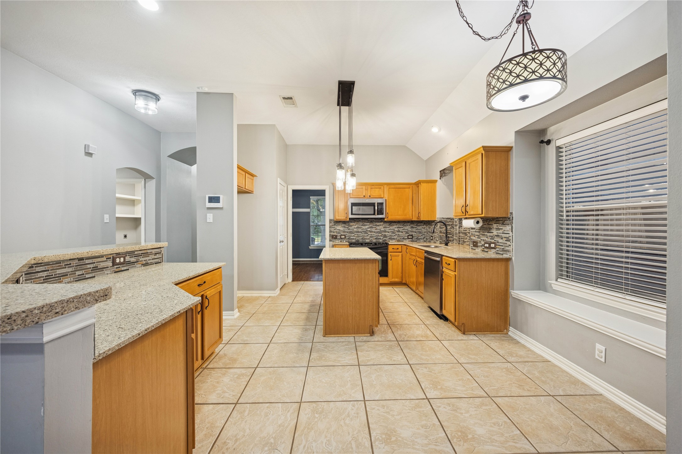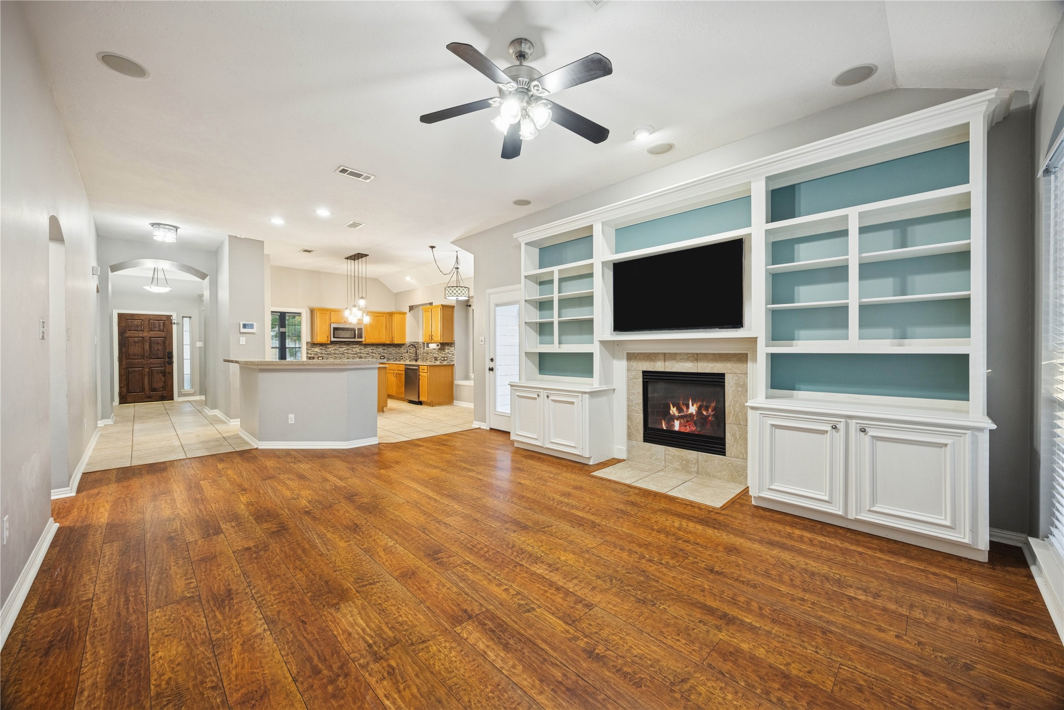 Welcome home to 15803 Stiller Park Drive, a beautifully maintained one-story David Weekley Home nestled in the heart of the master-planned Coles Crossing community. This charming residence features 3 bedrooms, 2 baths, and an inviting open-concept layout with soaring 11’ ceilings, rich toned luxury vinyl & tile flooring throughout. No carpet! The kitchen offers granite countertops, a stylish backsplash, center island, and flows seamlessly into the spacious family area with custom built-ins and a cozy gaslog fireplace. The split floor plan provides privacy for the primary suite with a spa-like bath featuring a garden tub and separate shower. Step outside to your backyard escape, complete with an extended covered patio, dual ceiling fans, string lighting, and artificial turf along the side yard for low-maintenance living. Zoned to one of Houston’s Top 10 high schools, this home perfectly blends comfort, convenience, and charm in a sought-after community! NO BACK NEIGHBORS!!!