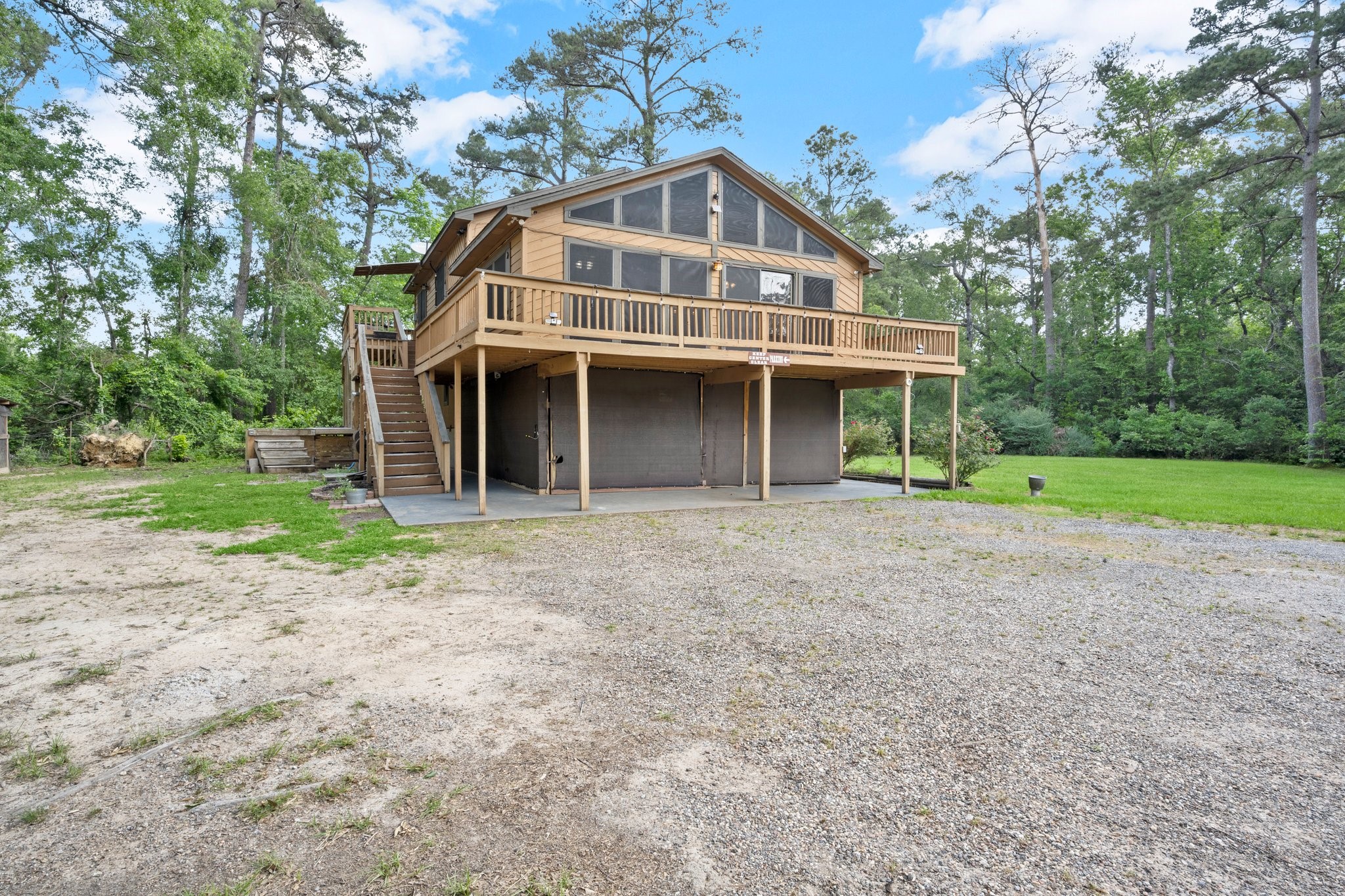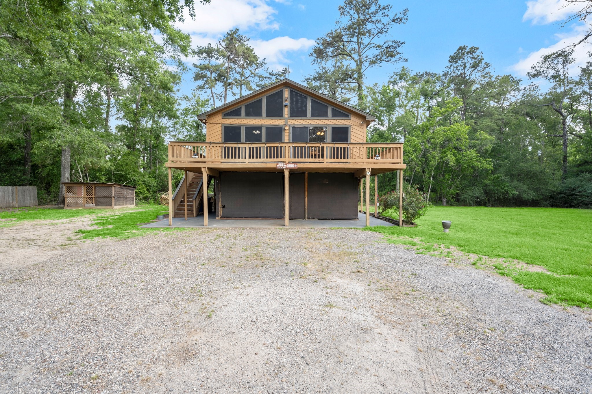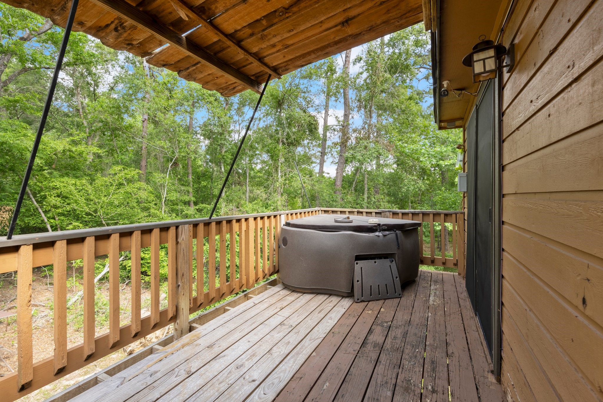 This rare gem is a gated 3-bedroom, 1.5-bath, 1.5-story home nestled on nearly 2 acres of peaceful, wooded land. Enjoy the perfect blend of quiet country living just minutes from major highways for easy access to the city. Open-concept design seamlessly connects the kitchen, dining, and living areas, all framed by walls of windows and soaring ceilings that flood the space with natural light. Solar screens provide comfort by softening the sun’s rays while still keeping the home bright and airy. This charming home has seen several upgrades, including Kitchen appliances: refrigerator, stove, microwave 2025, HVAC Dec 2024, downstairs flooring March 2025,well pump Nov 2024, bathrooms remodeled in 2016 with slate accents and spa tub, and exterior doors April 2025. Bonus plumbed outhouse. Wrap-around decking invites you to relax and soak in the serene wooded views. The mostly fenced property is private and quiet, complete with a meandering creek that adds to its natural beauty.