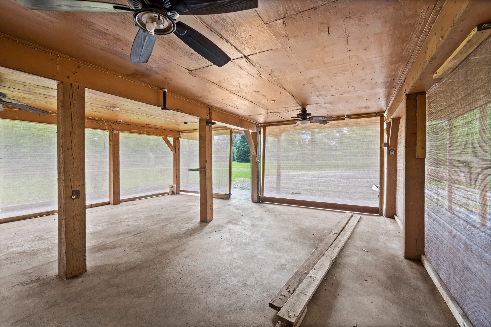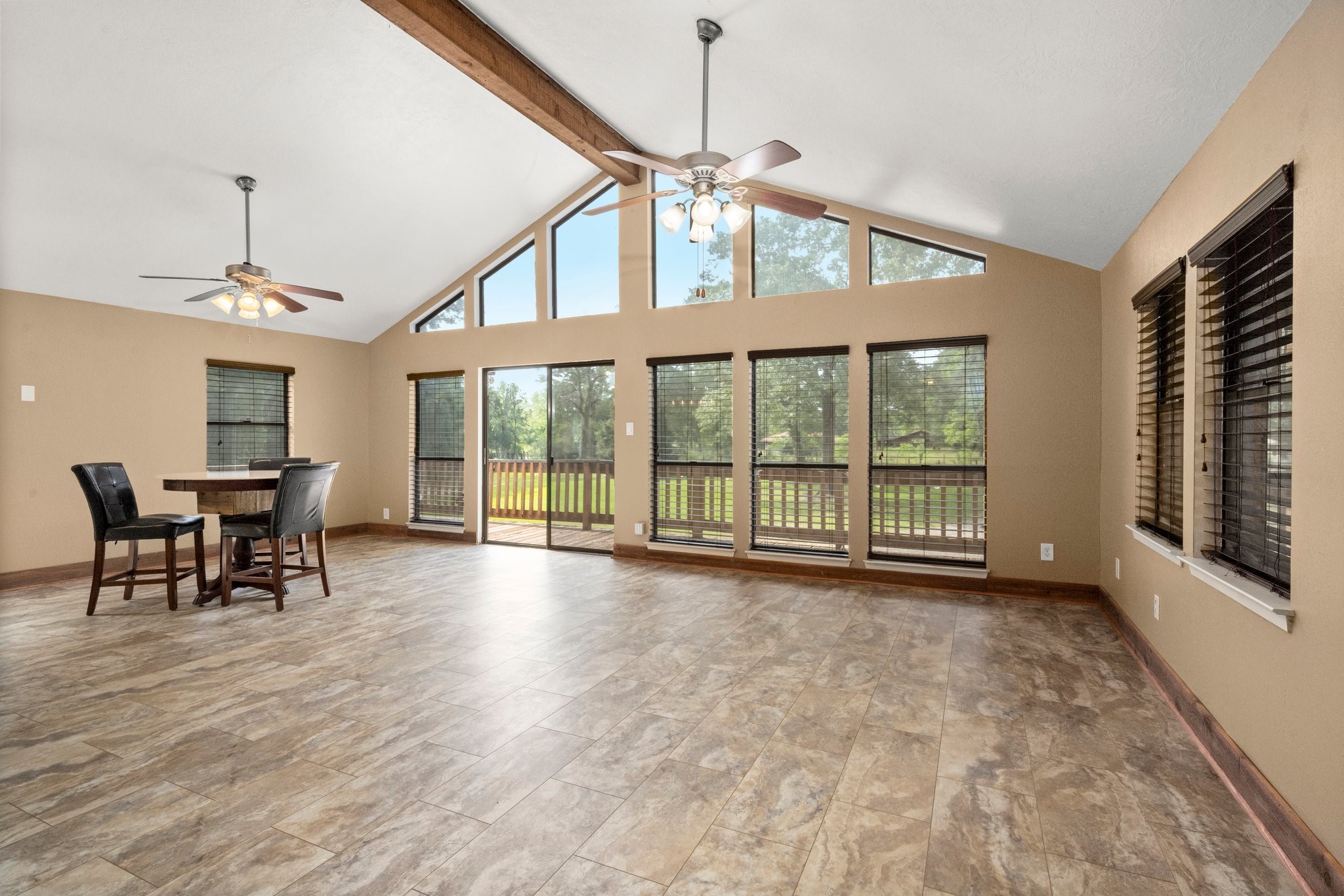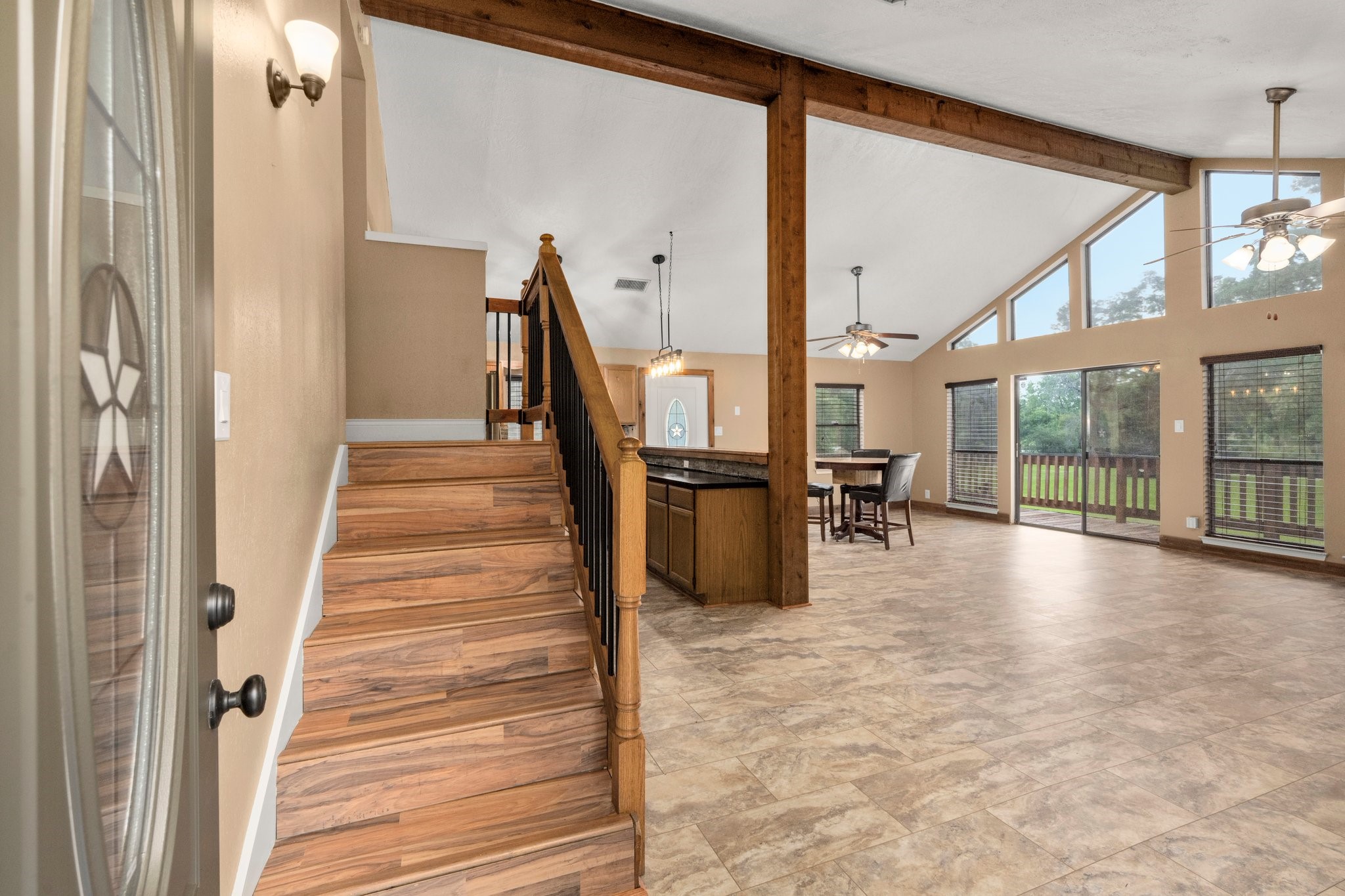 This rare gem is a gated 3-bedroom, 1.5-bath, 1.5-story home nestled on nearly 2 acres of peaceful, wooded land. Enjoy the perfect blend of quiet country living just minutes from major highways for easy access to the city. Open-concept design seamlessly connects the kitchen, dining, and living areas, all framed by walls of windows and soaring ceilings that flood the space with natural light. Solar screens provide comfort by softening the sun’s rays while still keeping the home bright and airy. This charming home has seen several upgrades, including Kitchen appliances: refrigerator, stove, microwave 2025, HVAC Dec 2024, downstairs flooring March 2025,well pump Nov 2024, bathrooms remodeled in 2016 with slate accents and spa tub, and exterior doors April 2025. Bonus plumbed outhouse. Wrap-around decking invites you to relax and soak in the serene wooded views. The mostly fenced property is private and quiet, complete with a meandering creek that adds to its natural beauty.