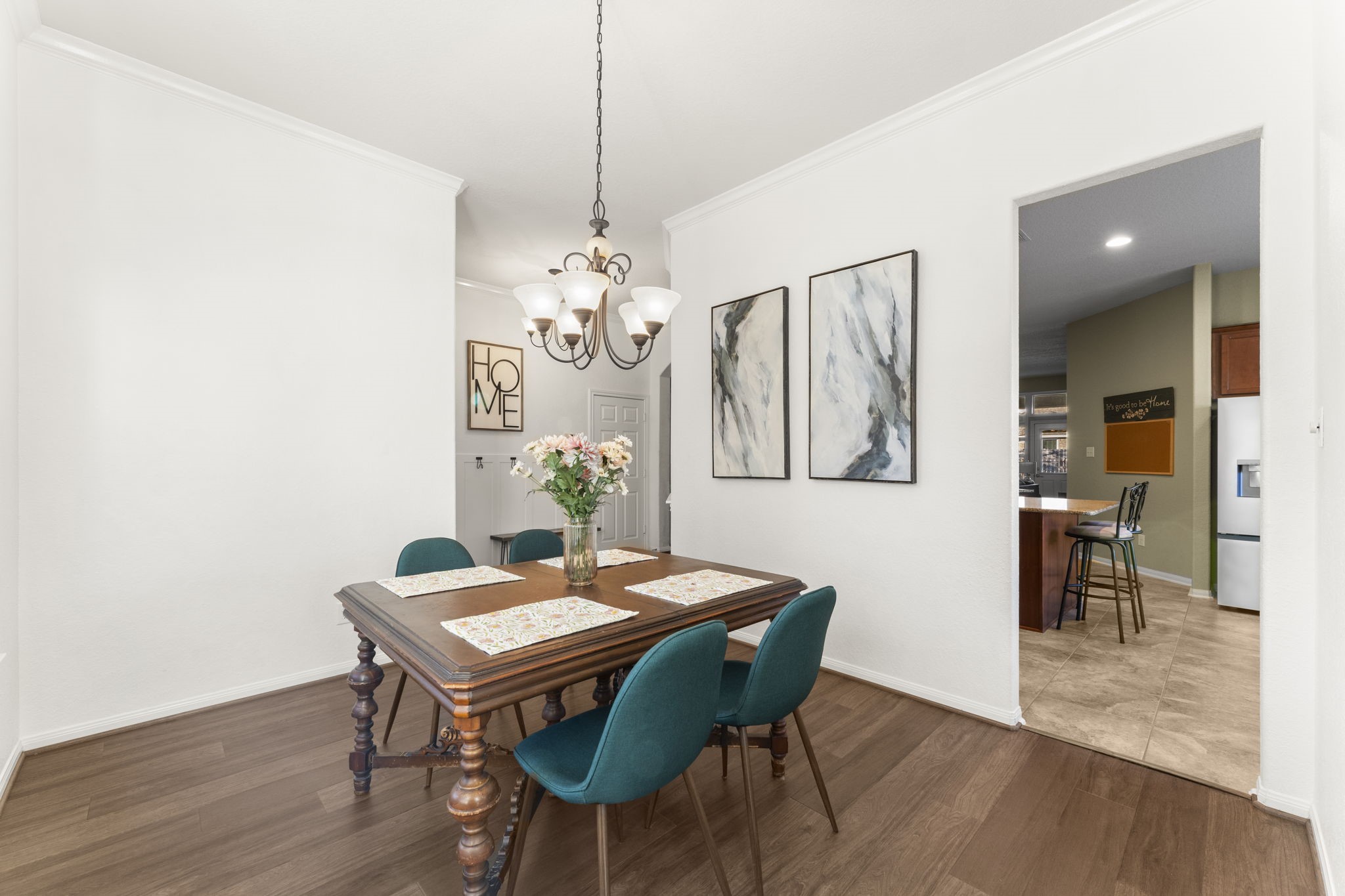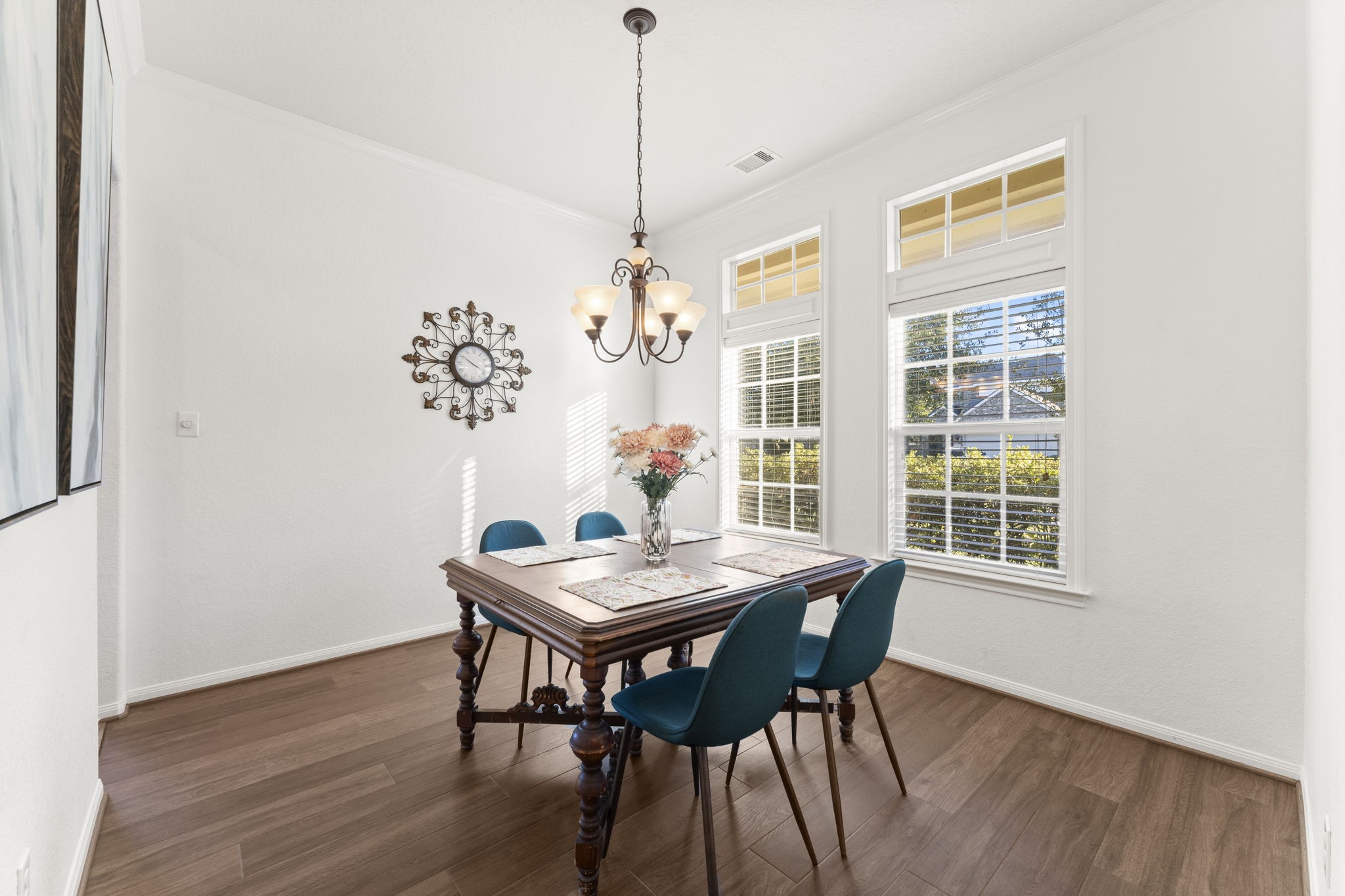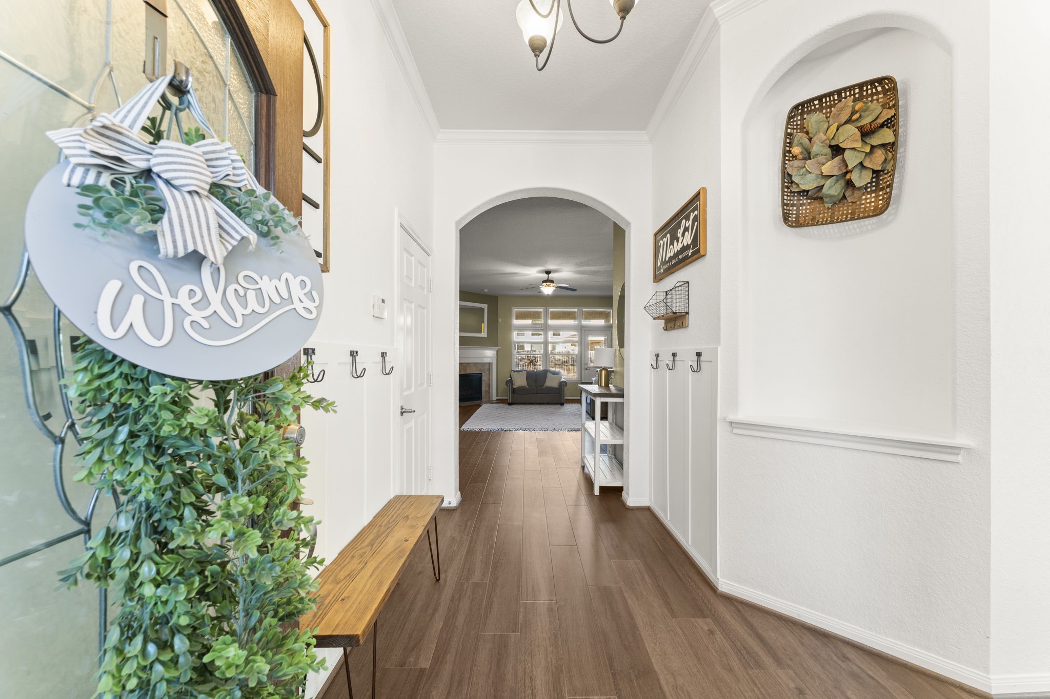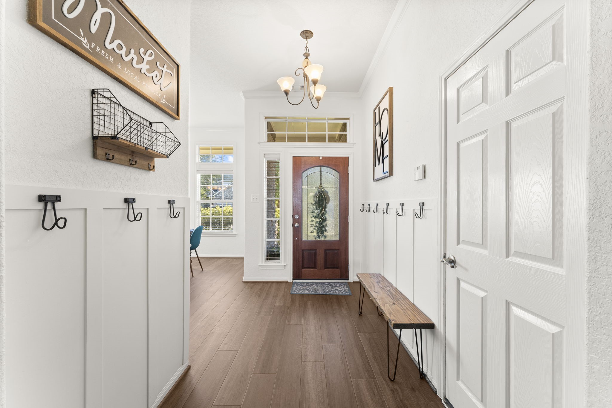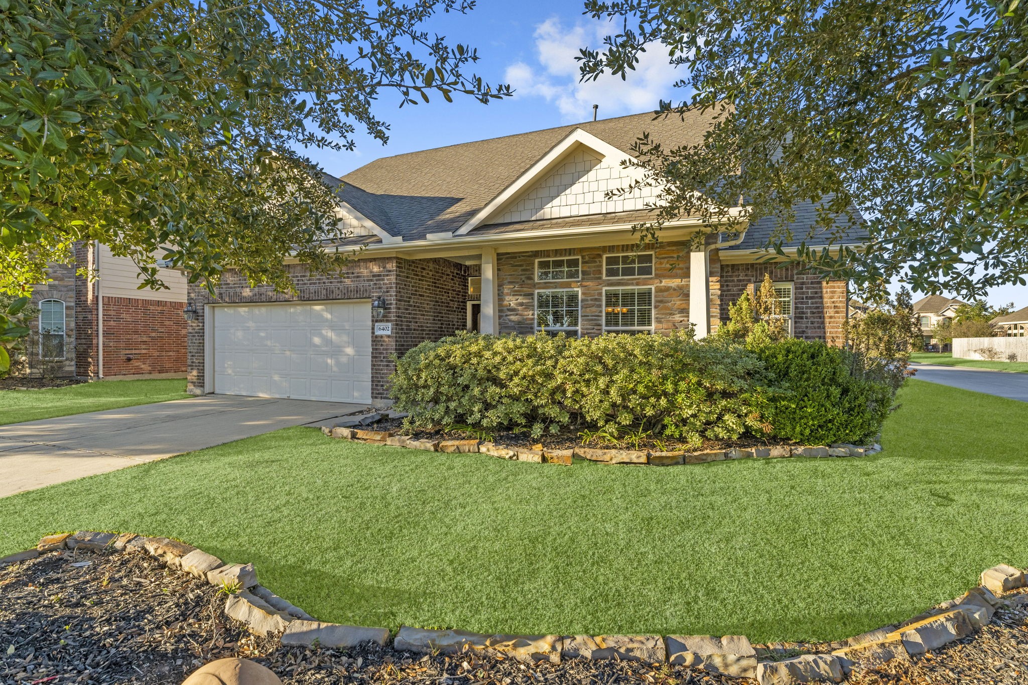 Nestled on a charming corner lot with mature trees, this home offers striking curb appeal. Natural light fills every room, creating a bright and inviting atmosphere. The formal dining room is perfect for entertaining. The kitchen features a central island, stainless steel appliances, ample counter and cabinet space, and a bright breakfast nook. The kitchen flows seamlessly into the living room, which boasts a cozy fireplace and large windows. A formal office provides an ideal workspace. The luxurious primary suite has plush carpeting, a tray ceiling, and a spa-like ensuite with a jetted tub and separate glass-enclosed shower. Secondary bedrooms are bright and airy, each with plush carpet. A spacious laundry room with extra storage completes this comfortable and stylish home. Step outside to a private backyard with a covered patio, perfect for relaxing or entertaining. Located within minutes to The Woodlands, Hwy 99, I-45, and all the great shopping and restaurants.