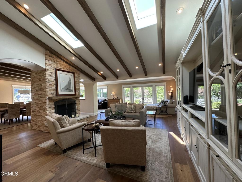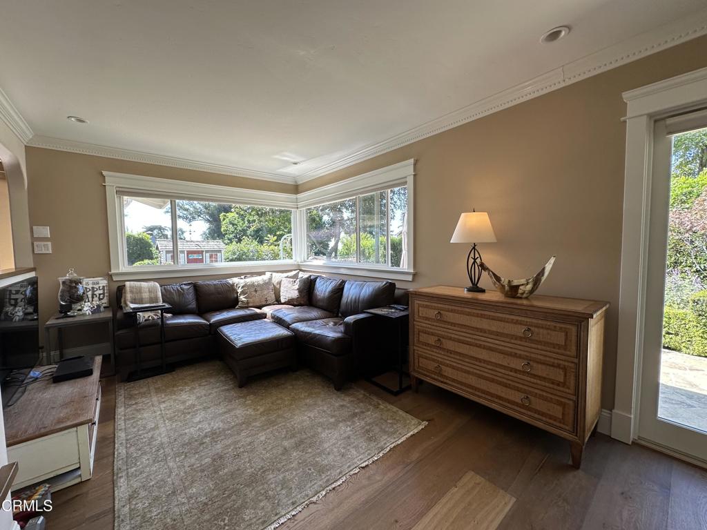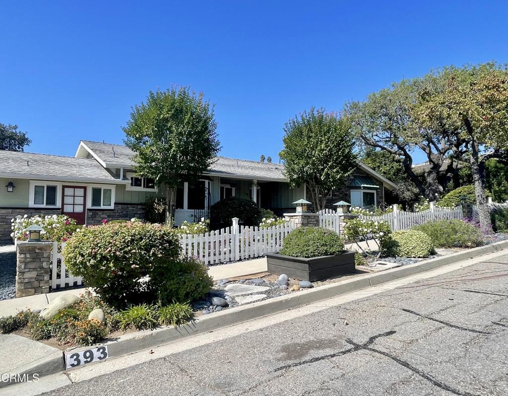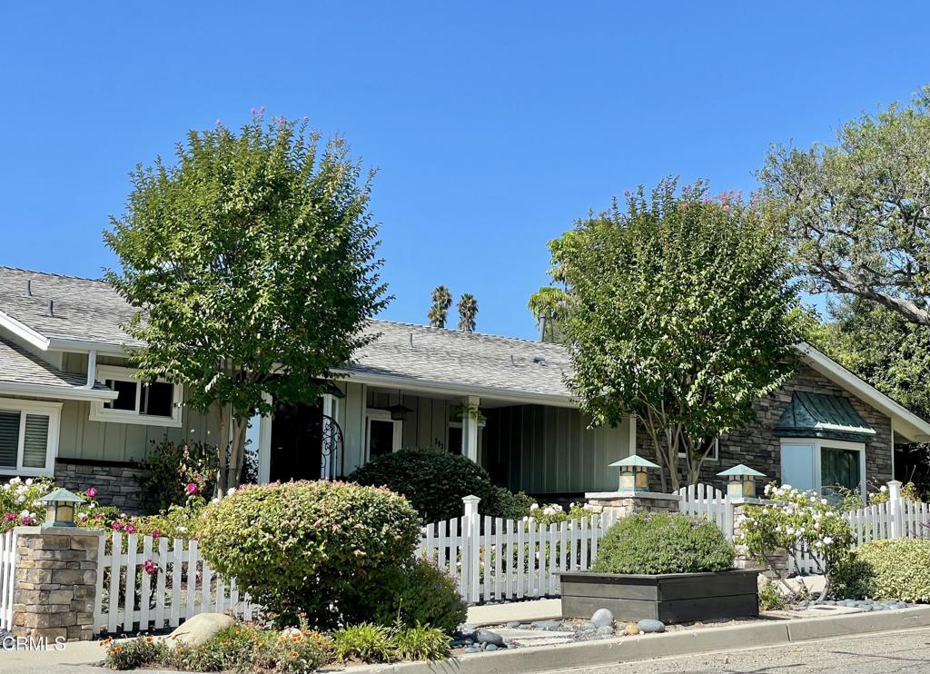 This Highly Desired & Well Updated Crestwood Estates, Custom Ventura Foothills Home, is an Alluring Single-Story Mid-Century Modern & Rustic Craftsman Villa. Set amongst a Sanctuary-Zen like Whimsical Garden array of Blooming Plants, Flowers, Shrubbery and Various Fruit Trees, all combined with Drought Resistant Landscaping. Featuring slight Distant Pacific Ocean Views, Area City Lights & Highly Enjoyable, Beautiful surrounding Garden Sunrises & Garden Sunsets. This Modern Vintage-Feel Home sits on over a Quarter Acre Lot & is Well Nestled high within a Small Enclave of Custom-Built Homes within a Semi-Private Cul-de-Sac. This Gorgeously Attractive & Luxuriously appointed Home currently features a Master Bedroom with Views of the front Garden, Secondary Master Bedroom with rear Garden Atrium Windows, Office/Bedroom Conversion with French Doors to a Side Retreat Garden and a Central Garden/Guest /ADU-type Room with its own Front Entrance & Rear Opening Garden Patio Door. The Home has an Eloquently updated Full Bathroom, 3/4 Bathroom & an adjacent dedicated Laundry Room. New Homeowner's will be Enthralled with a bright, large Gourmet walk thru Galley-Style Kitchen, with windows overlooking the front garden, well-appointed with High-Line Thermador/Bosch Kitchen Appliances, that flows around into an Atrium Window front Garden Nook space featuring a vast amount of Unique Polished & Contoured Stone Counter Tops, Hidden Media Television, Floating Wine Glass & Coffee Cup Custom Shelving and Modern Soft & Self Closing Cabinetry throughout the Kitchen, Pantry & Nook Areas. From the Kitchen and Nook area, you then flow into an open Vaulted Ceiling Area with Exposed Rustic Wooden Beams overhead, into Lovely, Formal and Cozy Dining Room surrounded with View Windows and French Glass Doors looking into the Zen-like backyard Garden settings. The Dining Room also flows around both sides of a fully covered Slate Stone tiled Dining Accessory Niche, backing the Great Room Fireplace. The dual flow walkway opens to a Great Room Living Area, Entry Foyer, with Abundant Sitting Areas and combined Family Media TV Rooms to Socialize & Entertain. This spacious open area also features Tall, Vaulted Ceilings with Exposed Overhead Rustic Wooden Beams, Bright-Airy Skylighted Windows and French Glass Doors, all looking out & leading into the Lush Beautiful rear Garden, Meditation and Outdoor Social Patio Spaces.