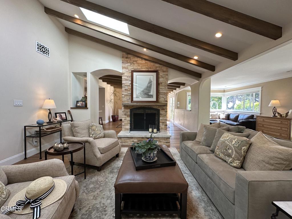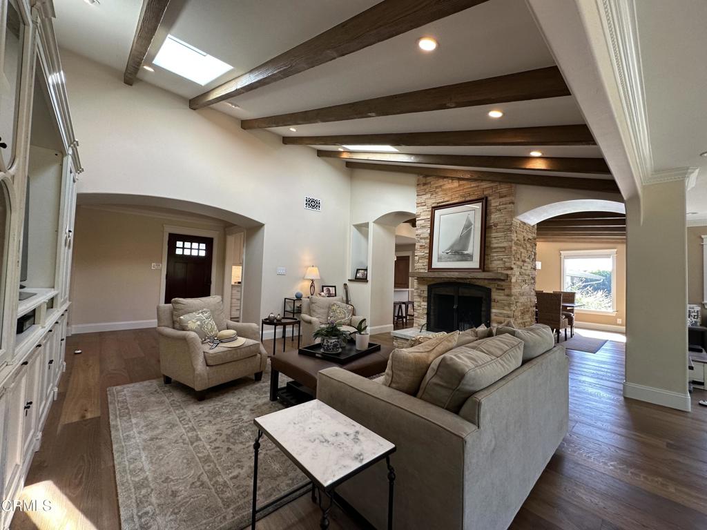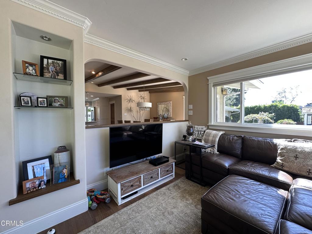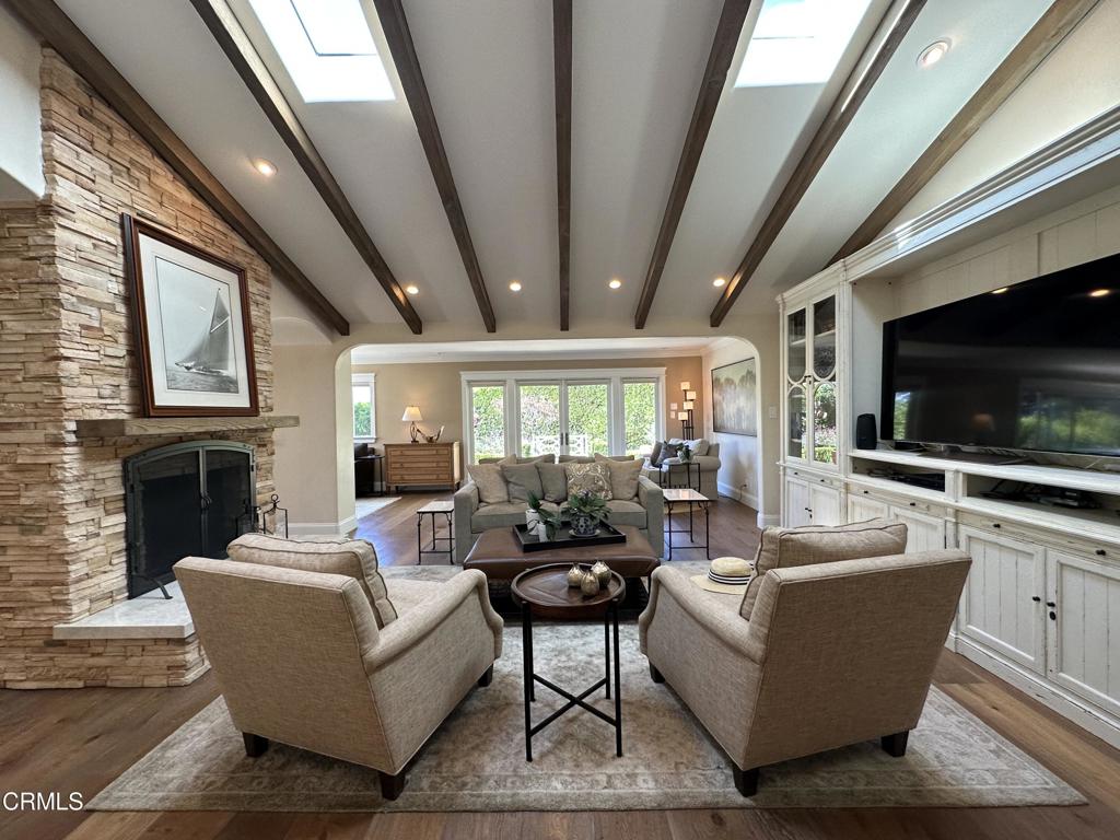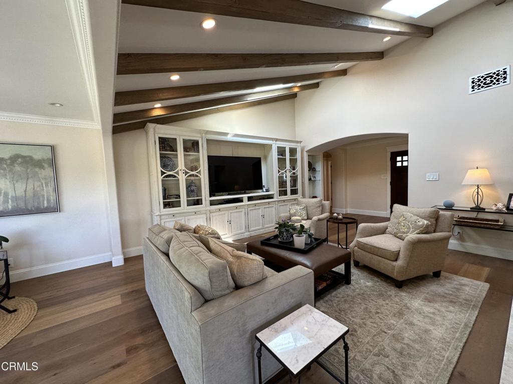 This Highly Desired & Well Updated Crestwood Estates, Custom Ventura Foothills Home, is an Alluring Single-Story Mid-Century Modern & Rustic Craftsman Villa. Set amongst a Sanctuary-Zen like Whimsical Garden array of Blooming Plants, Flowers, Shrubbery and Various Fruit Trees, all combined with Drought Resistant Landscaping. Featuring slight Distant Pacific Ocean Views, Area City Lights & Highly Enjoyable, Beautiful surrounding Garden Sunrises & Garden Sunsets. This Modern Vintage-Feel Home sits on over a Quarter Acre Lot & is Well Nestled high within a Small Enclave of Custom-Built Homes within a Semi-Private Cul-de-Sac. This Gorgeously Attractive & Luxuriously appointed Home currently features a Master Bedroom with Views of the front Garden, Secondary Master Bedroom with rear Garden Atrium Windows, Office/Bedroom Conversion with French Doors to a Side Retreat Garden and a Central Garden/Guest /ADU-type Room with its own Front Entrance & Rear Opening Garden Patio Door. The Home has an Eloquently updated Full Bathroom, 3/4 Bathroom & an adjacent dedicated Laundry Room. New Homeowner's will be Enthralled with a bright, large Gourmet walk thru Galley-Style Kitchen, with windows overlooking the front garden, well-appointed with High-Line Thermador/Bosch Kitchen Appliances, that flows around into an Atrium Window front Garden Nook space featuring a vast amount of Unique Polished & Contoured Stone Counter Tops, Hidden Media Television, Floating Wine Glass & Coffee Cup Custom Shelving and Modern Soft & Self Closing Cabinetry throughout the Kitchen, Pantry & Nook Areas. From the Kitchen and Nook area, you then flow into an open Vaulted Ceiling Area with Exposed Rustic Wooden Beams overhead, into Lovely, Formal and Cozy Dining Room surrounded with View Windows and French Glass Doors looking into the Zen-like backyard Garden settings. The Dining Room also flows around both sides of a fully covered Slate Stone tiled Dining Accessory Niche, backing the Great Room Fireplace. The dual flow walkway opens to a Great Room Living Area, Entry Foyer, with Abundant Sitting Areas and combined Family Media TV Rooms to Socialize & Entertain. This spacious open area also features Tall, Vaulted Ceilings with Exposed Overhead Rustic Wooden Beams, Bright-Airy Skylighted Windows and French Glass Doors, all looking out & leading into the Lush Beautiful rear Garden, Meditation and Outdoor Social Patio Spaces.