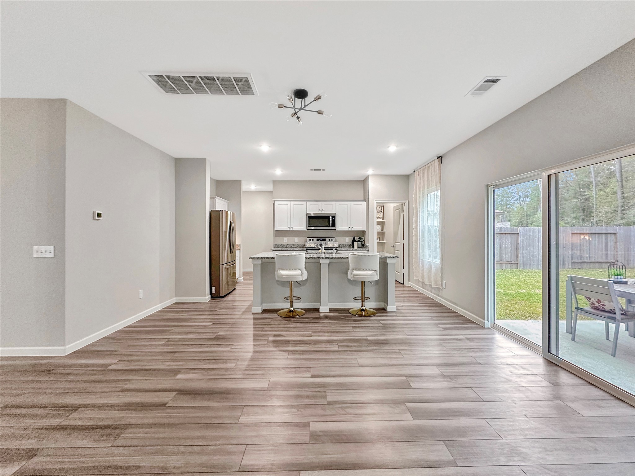 Beautiful home perfectly tucked away on a quiet cul-de-sac street w/ no back neighbors—offering both comfort & privacy. This move-in ready home features 4 spacious bedrooms, 2.5 baths, and an inviting layout ideal for modern living. Luxury vinyl plank flooring, 2025 interior paint, and a professionally cleaned Enjoy high ceilings, recessed lighting, upgraded ceiling fans & hardware that exceed builder grade—bringing style & efficiency. Stunning kitchen features large center island with a deep dual sink, stainless steel appliances, and whisper-close cabinets and drawers. The island offers seating space for casual conversations or gathering while cooking. Includes 2 thermostats for efficient climate control. Home is steps away from park. Community remains quiet & inviting-park benches, walking trails & doggie stations.Road improvements currently underway- long term benefit for daily commutes & local convenience. Thoughtful upgrades, modern style & excellent location. Truly move-in ready!