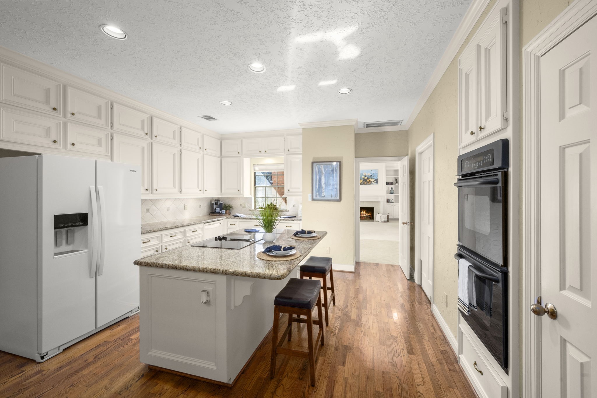 Custom, custom, custom! Low-maintenance one-story luxury living in sought-after Champions Glen w/ a highly desirable split floor plan. This David Taylor home impresses with dramatic 14' gambrel ceilings in the spacious family room w/ custom built-ins and a gas-log fireplace. Elegant formal dining showcases 12' gambrel ceilings w/ a butler’s door to the chef’s kitchen offering GE Profile appliances, dbl. ovens, granite counters, under-cabinet lighting, metal pot-and-pan pull-outs, and a built-in buffet. The expansive primary opens to a sunlit porch oasis with spa-like en-suite bath—dual sinks, jetted tub, separate shower, and a HUGE custom closet. Two additional bedroom/flex spaces include walk-in closets. Plantation shutters, double-pane tilt-in windows, abundant storage, in-house utility room, oversized attached garage, and double-wide aggregate driveway. Quiet 97-home community minutes to medical, dining, shopping & major routes—249, Beltway 8, I-45 & 99. No flooding. Move-in ready!