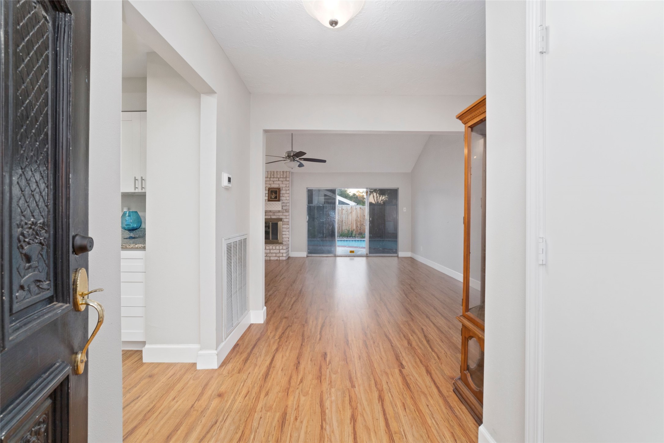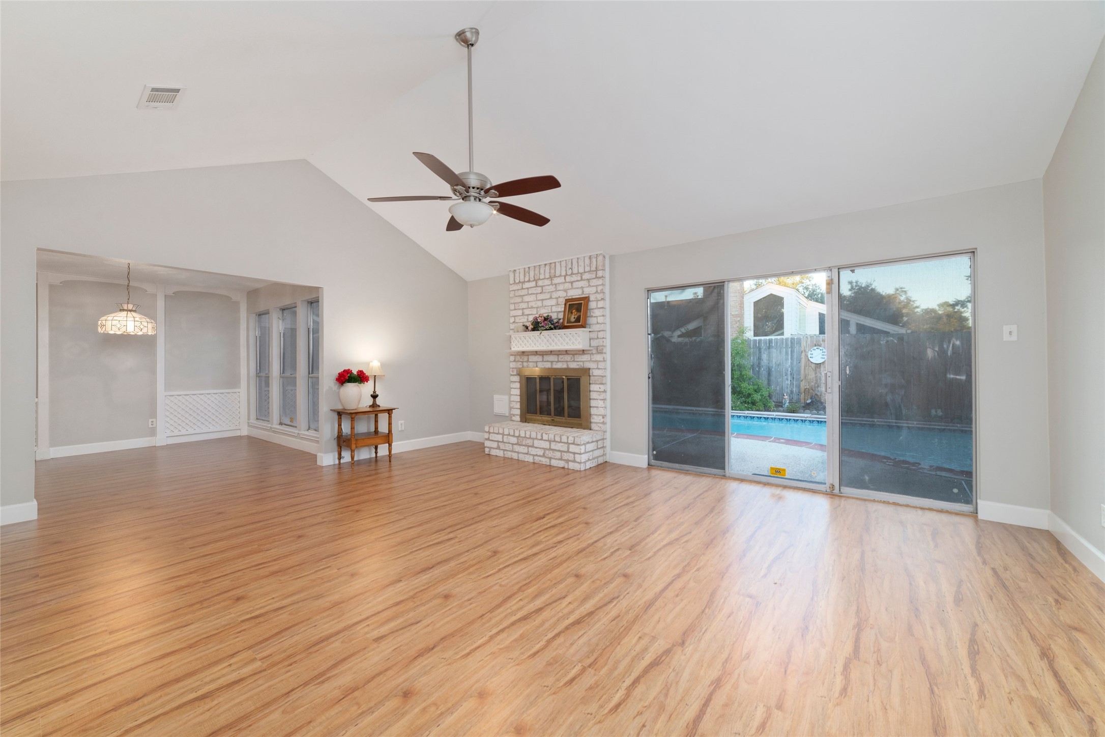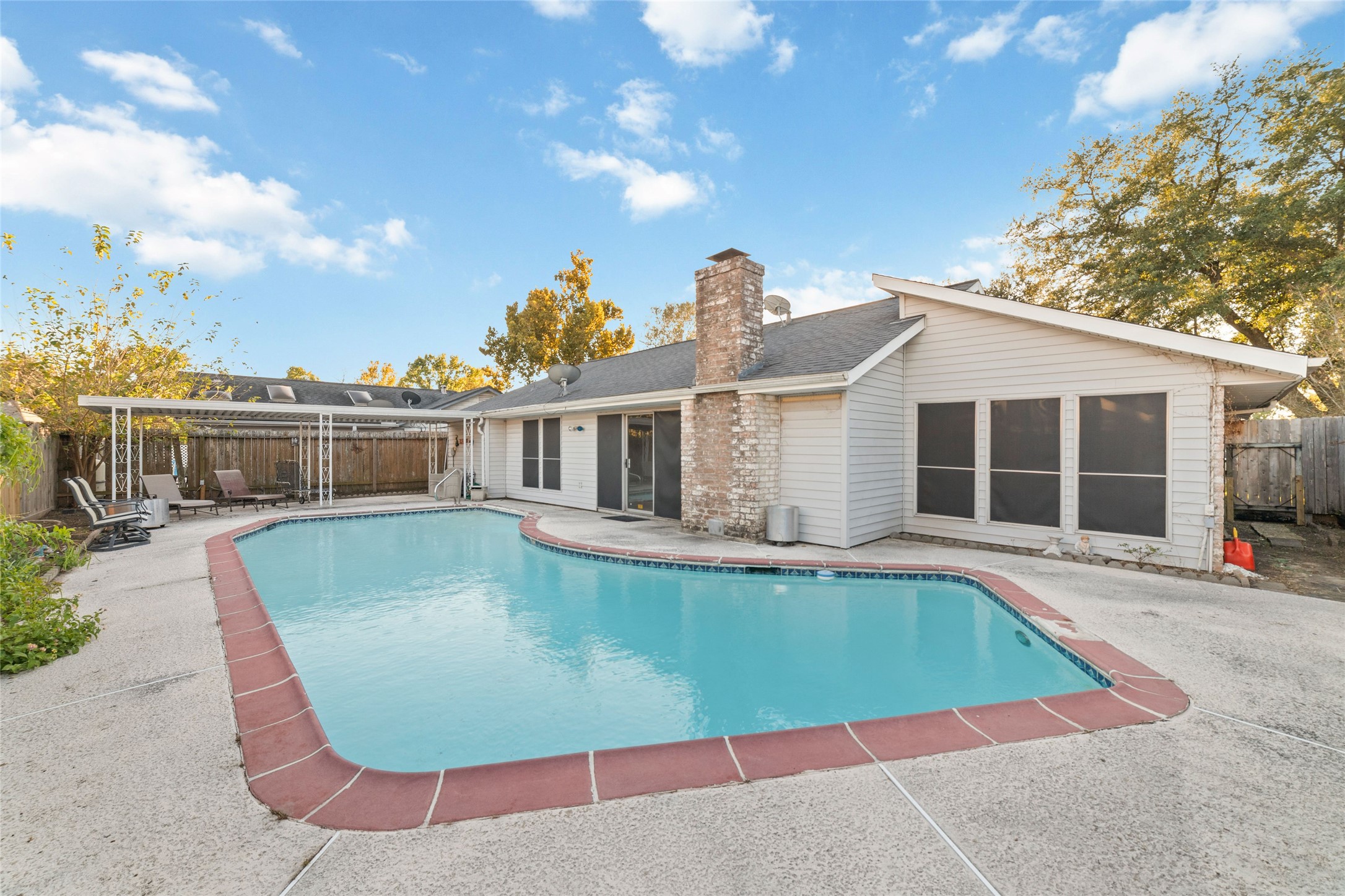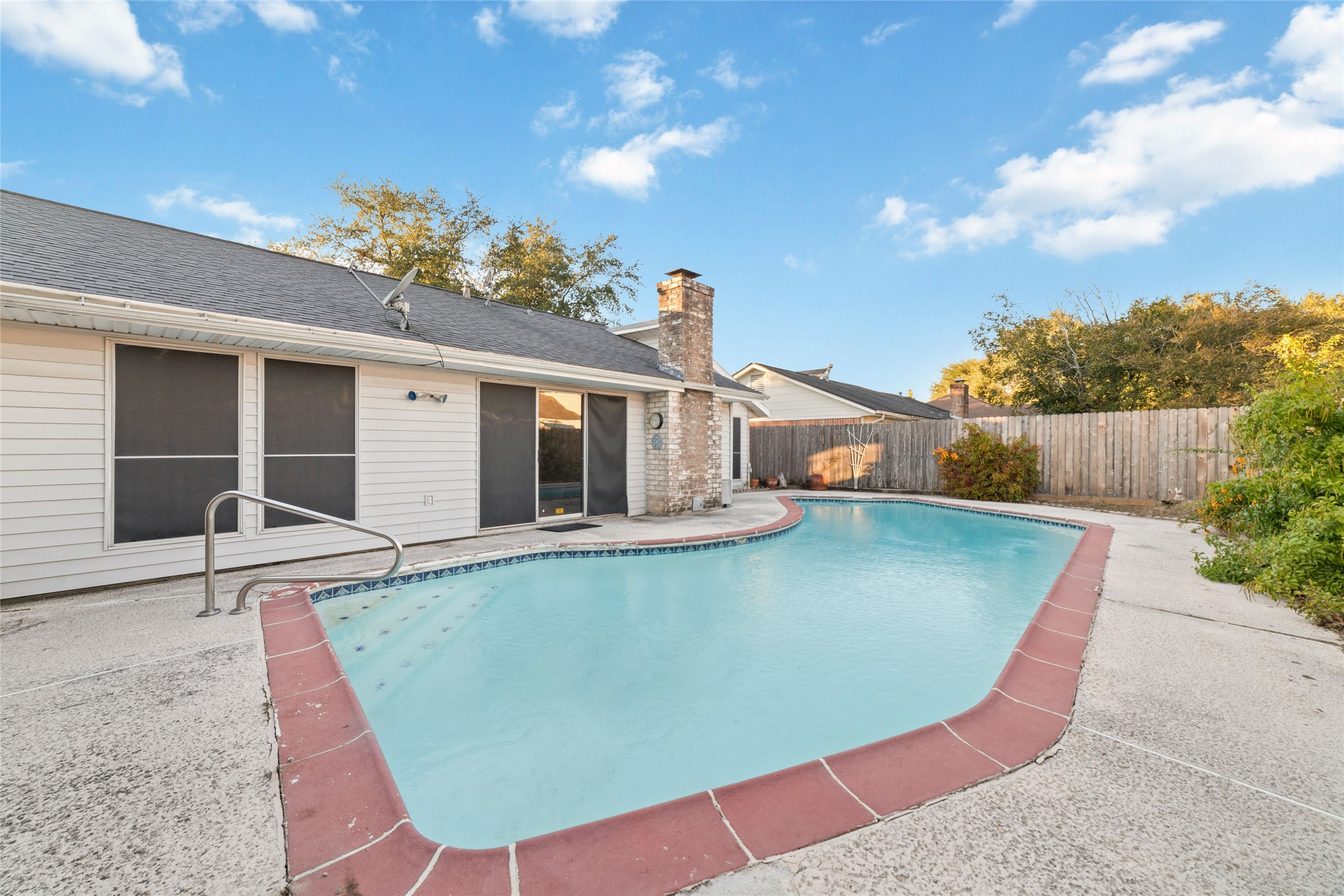 Pretty one story with pool, covered patio. Bright, totally remodeled kitchen (beautiful stainless fridge can stay). Granite countertops, deep stainless double sink with pull out faucet. New craftsman style white soft -close cabinets & drawers, lazy-susan in corner. Breakfast area leads to laundry room (W&D can stay), second pantry & garage. Formal dining (or flex room) has beautiful Tiffany style light fixture & overlooks pool. Large family room has gas-log fireplace, wood laminate flooring & full view of backyard & pool. Primary bedroom also overlooks back/pool, high Cathedral ceiling, deep walk-in closet & bright bathroom with lots of cabinet & counter space including vanity area & stunning walk-in shower with seamless glass & pretty tile work & sitting ledge. New gas water heater in 2025. Sprinkler system covers front yard. Only carpet in 2 bedrooms - otherwise tile & laminate flooring. Some areas need a little TLC but lets work something out!! No Flooding!