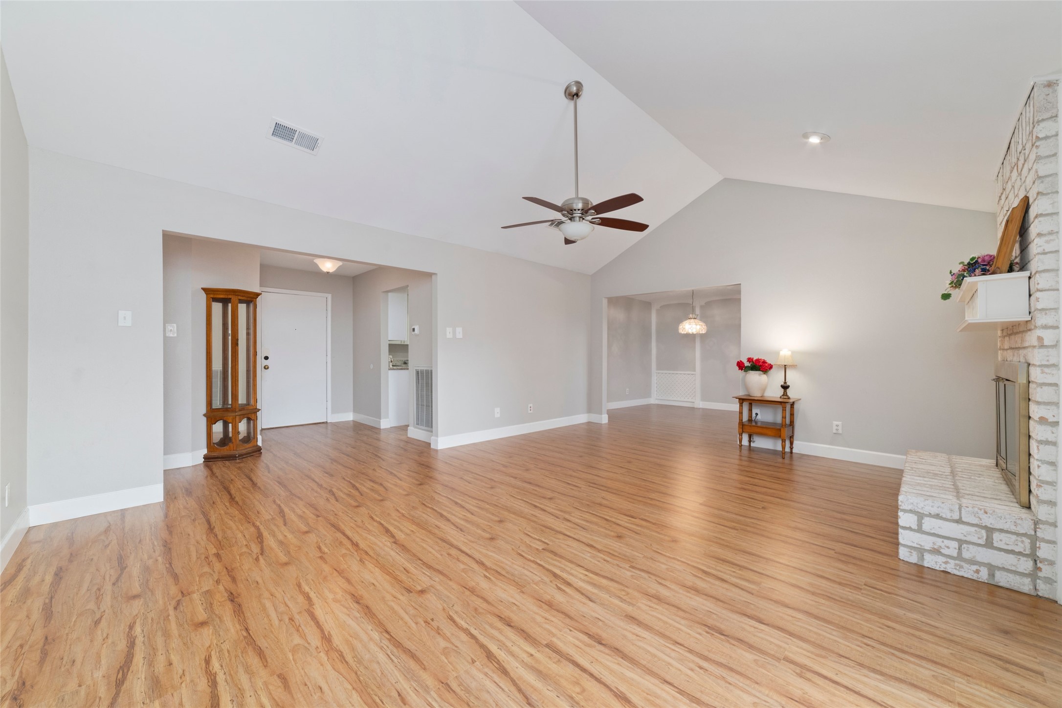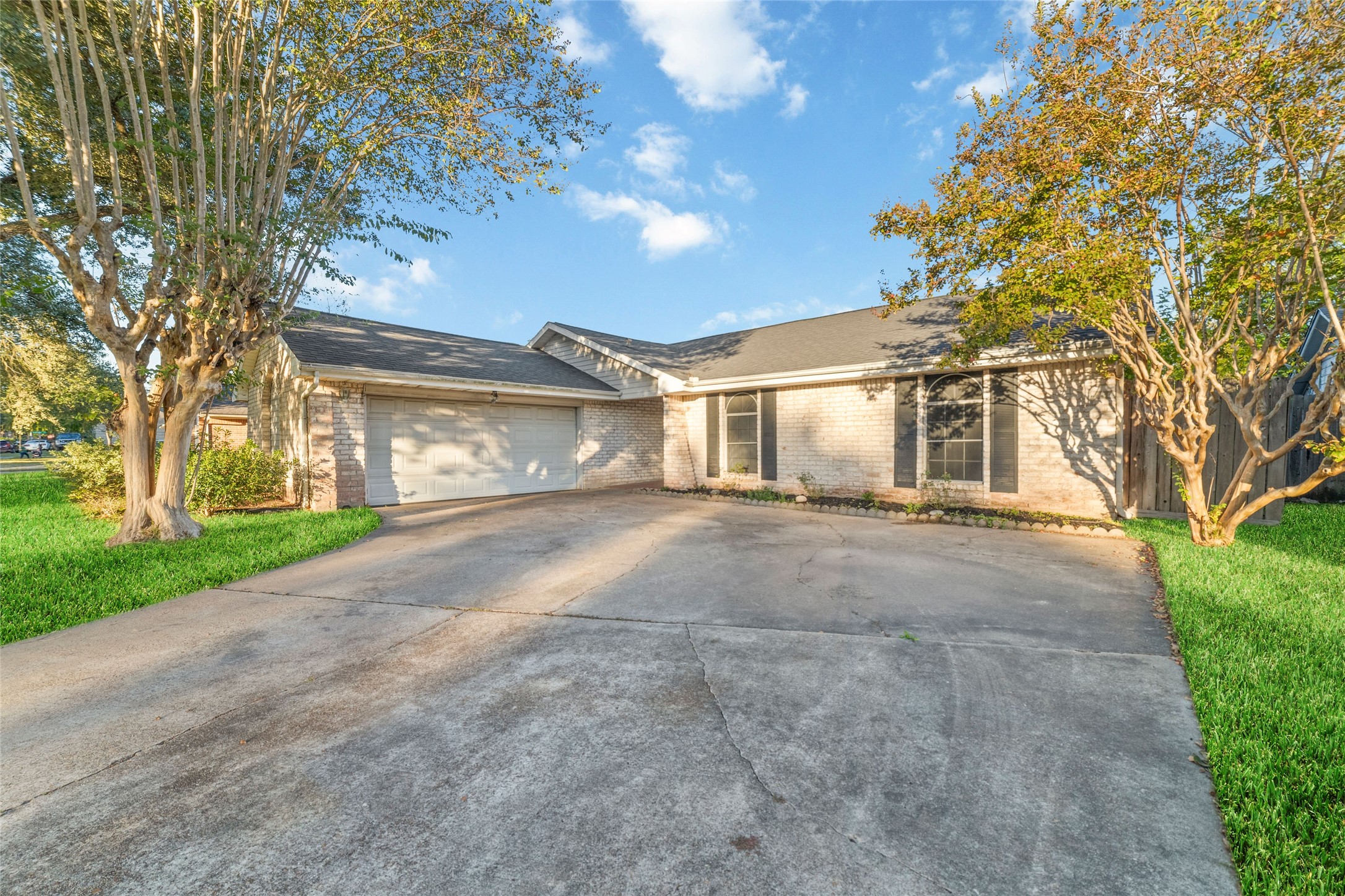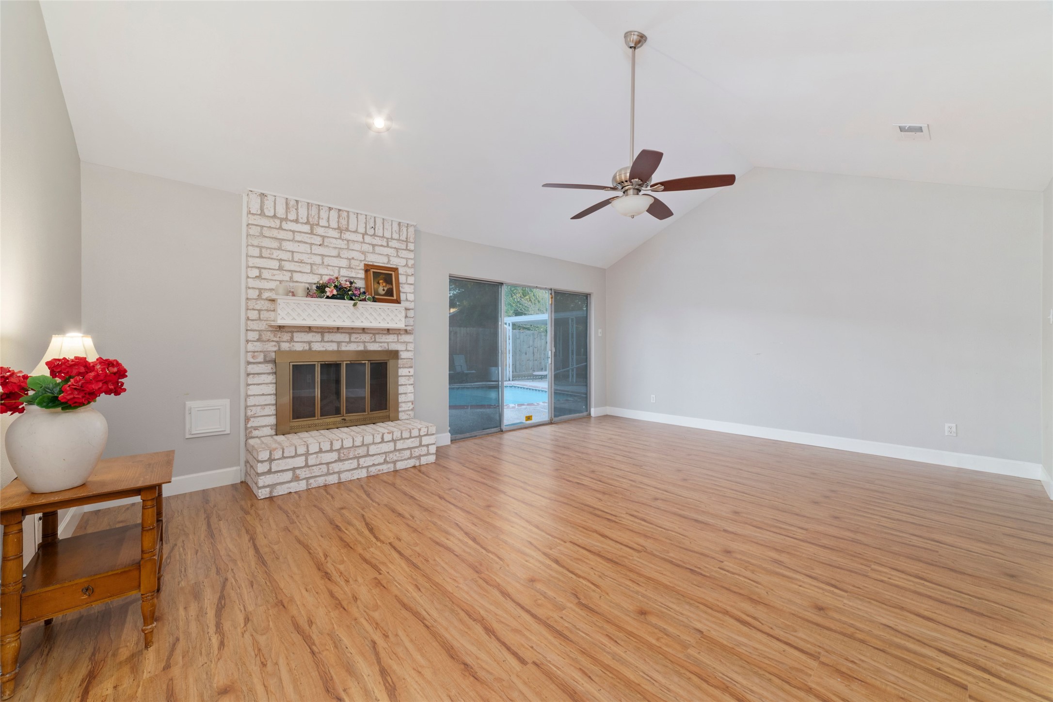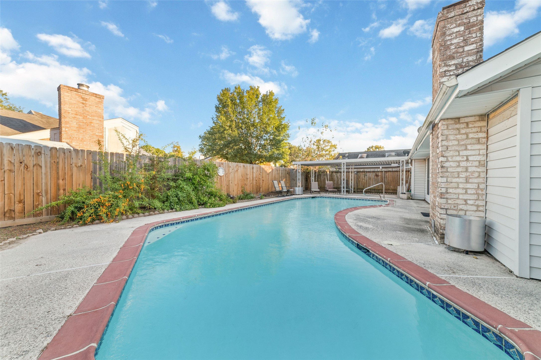 Pretty one story with pool, covered patio. Bright, totally remodeled kitchen (beautiful stainless fridge can stay). Granite countertops, deep stainless double sink with pull out faucet. New craftsman style white soft -close cabinets & drawers, lazy-susan in corner. Breakfast area leads to laundry room (W&D can stay), second pantry & garage. Formal dining (or flex room) has beautiful Tiffany style light fixture & overlooks pool. Large family room has gas-log fireplace, wood laminate flooring & full view of backyard & pool. Primary bedroom also overlooks back/pool, high Cathedral ceiling, deep walk-in closet & bright bathroom with lots of cabinet & counter space including vanity area & stunning walk-in shower with seamless glass & pretty tile work & sitting ledge. New gas water heater in 2025. Sprinkler system covers front yard. Only carpet in 2 bedrooms - otherwise tile & laminate flooring. Some areas need a little TLC but lets work something out!! No Flooding!