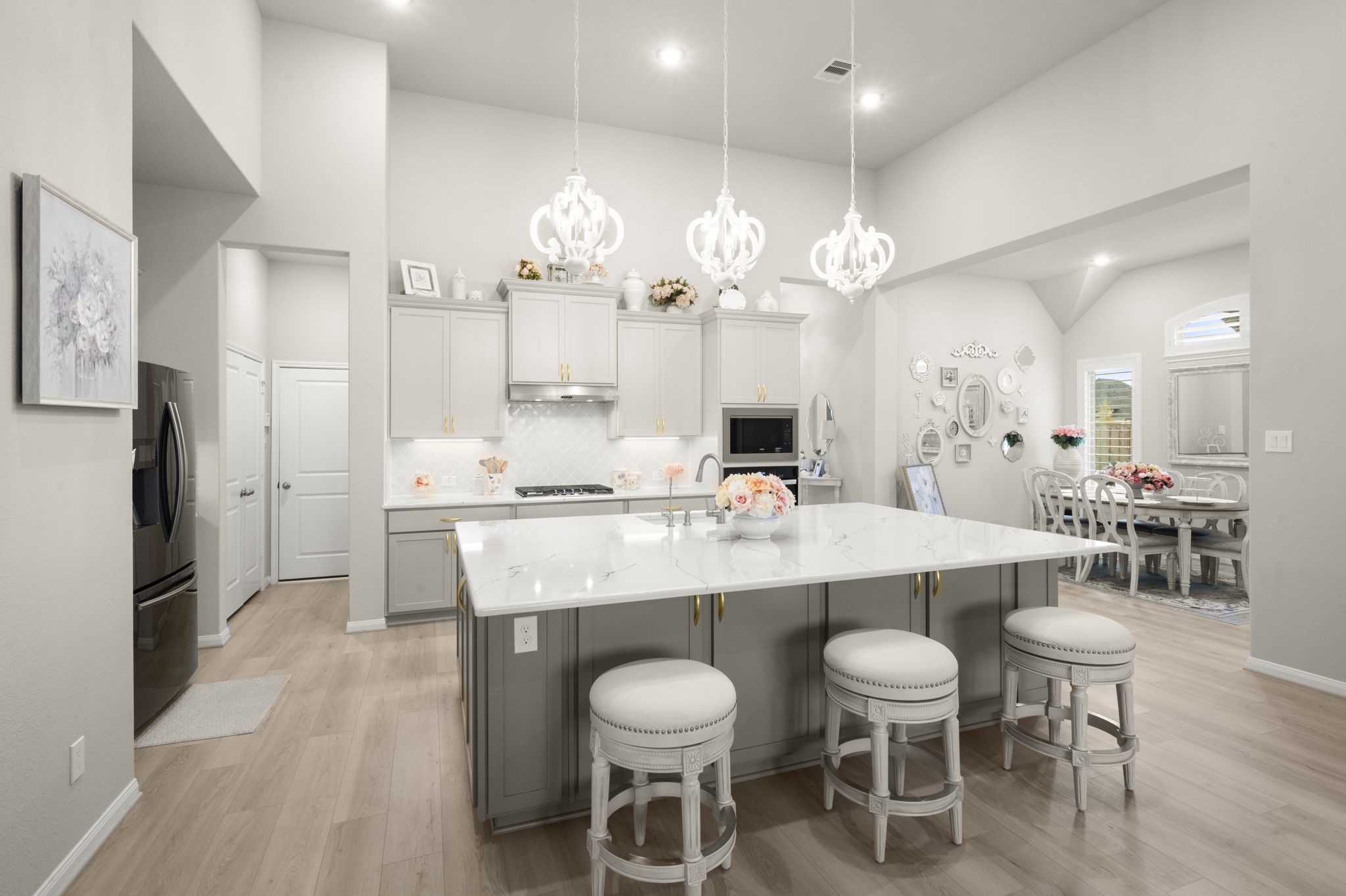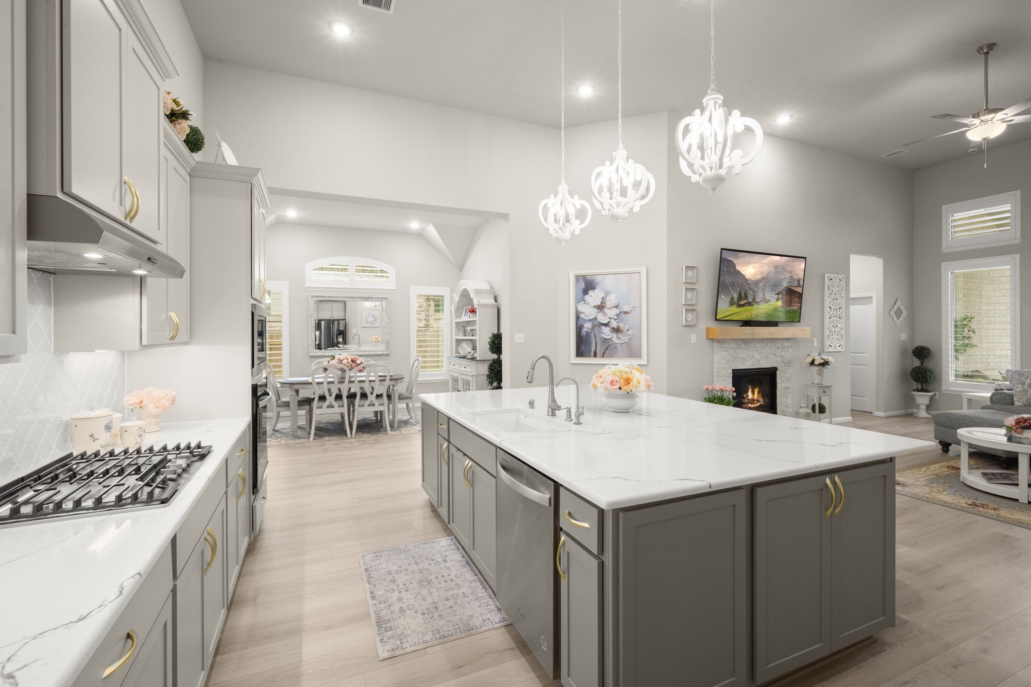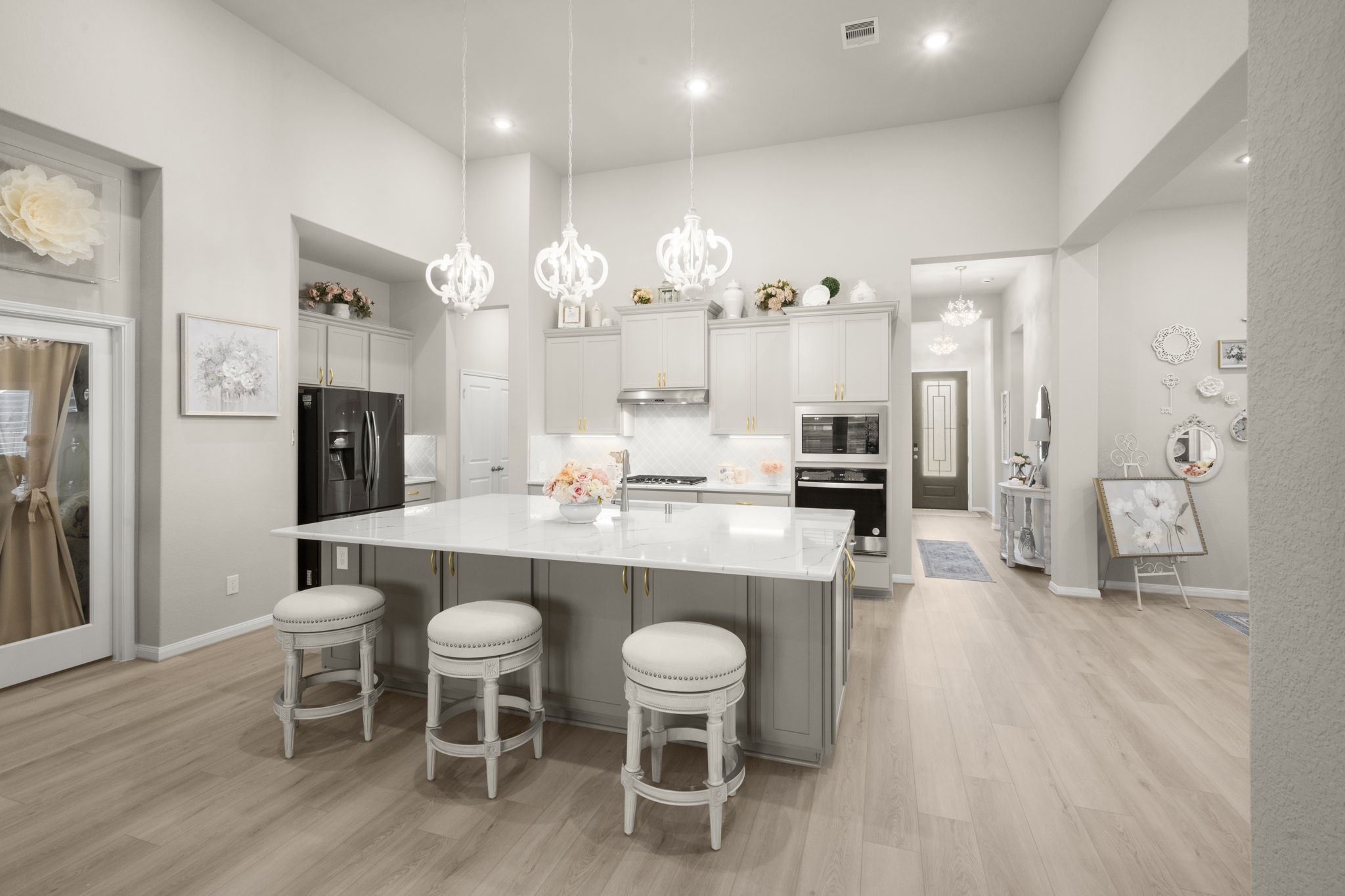 Stunning nearly new one-story home on an oversized lot with no back neighbors. This 4-bedroom, 4-bath layout includes a private study, game room, and 3-car tandem garage. The main living and kitchen areas feature soaring 14' ceilings, abundant natural light, and a gas log fireplace. The gourmet kitchen offers Omega Stone countertops, double ovens, gas range, farmhouse sink and a large island overlooking the living area. The split-floor plan provides two en-suite bedrooms at the front and two additional bedrooms with a shared bath at the back. The luxurious primary suite includes high ceilings, a soaking tub, oversized shower with seating, and a spacious walk-in closet. Backyard includes a covered patio and full fencing. Community amenities include parks, trails, pool, splash pad, and clubhouse.