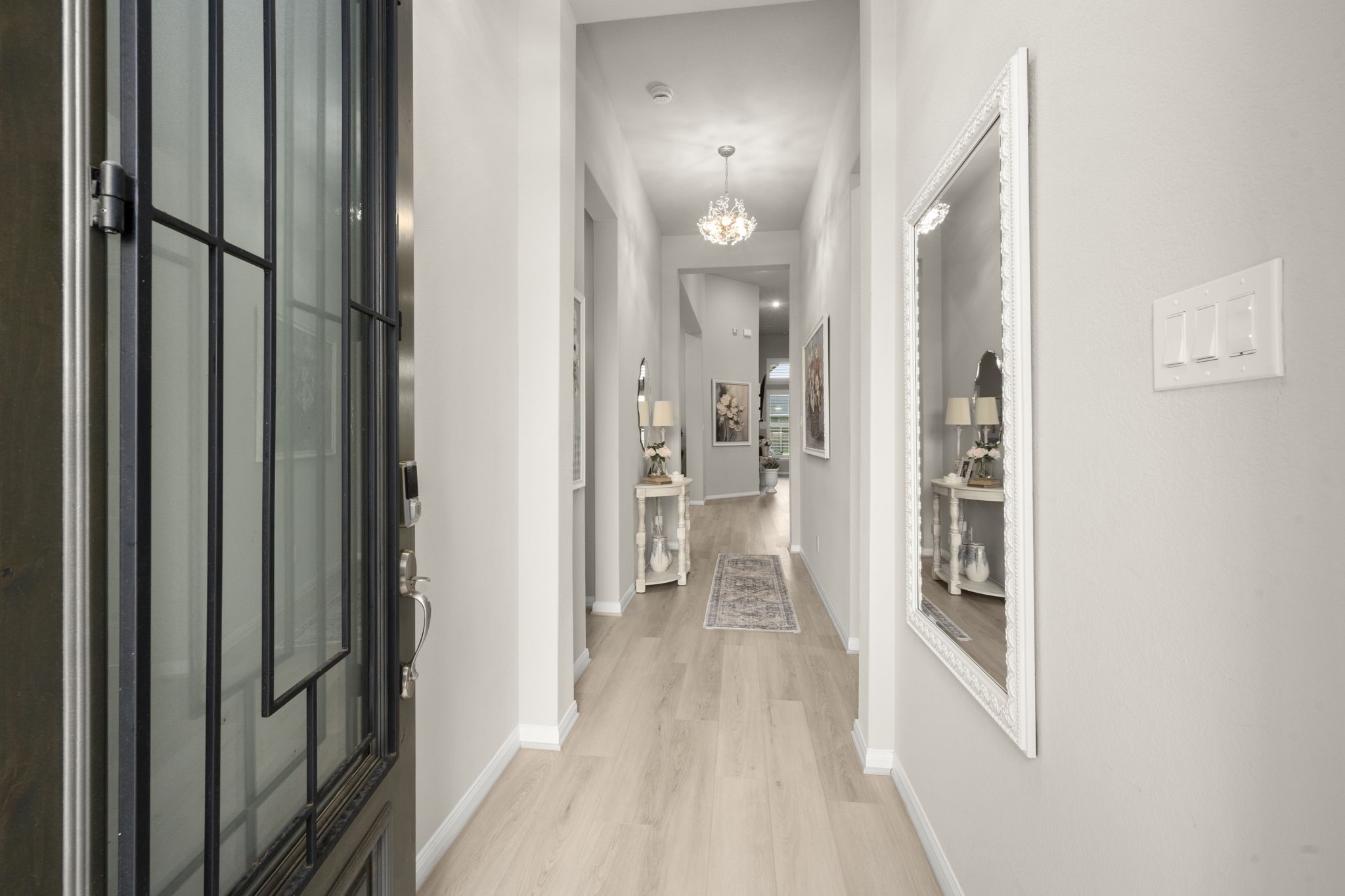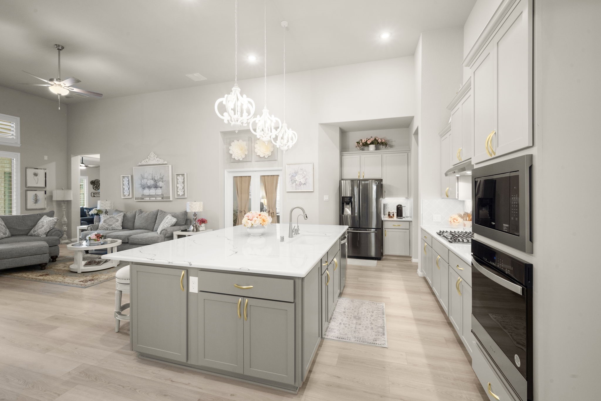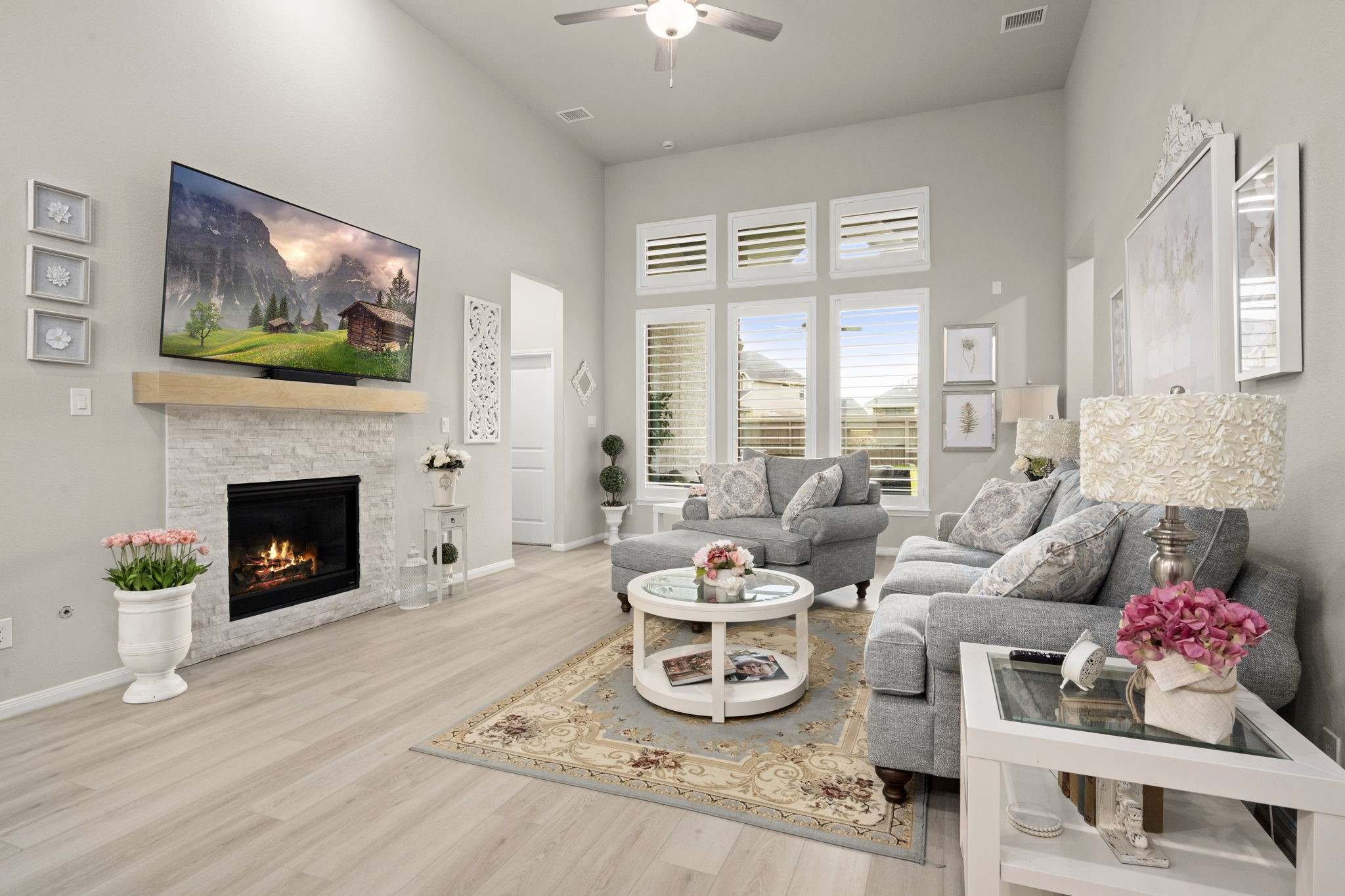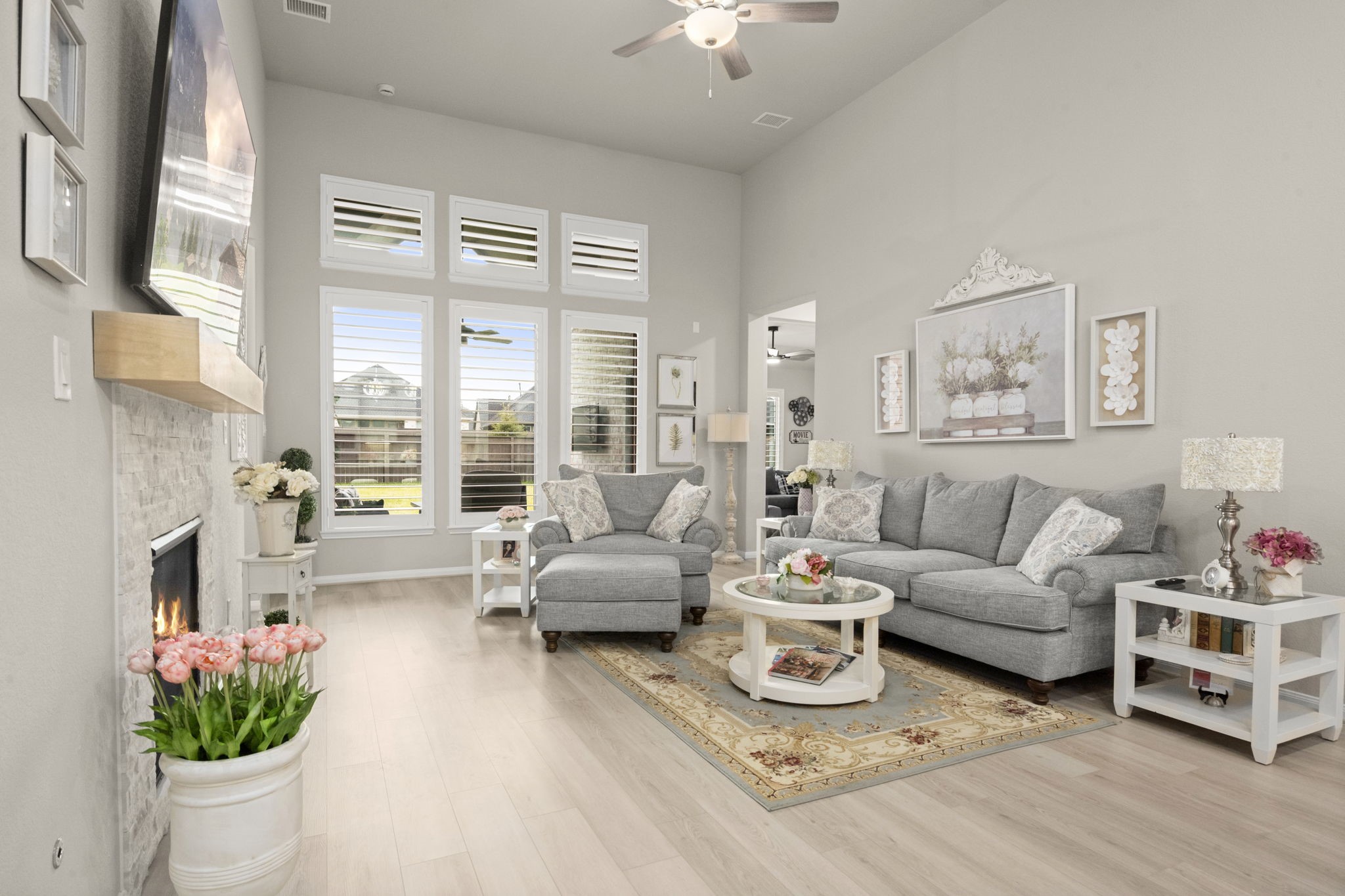Stunning nearly new one-story home on an oversized lot with no back neighbors. This 4-bedroom, 4-bath layout includes a private study, game room, and 3-car tandem garage. The main living and kitchen areas feature soaring 14' ceilings, abundant natural light, and a gas log fireplace. The gourmet kitchen offers Omega Stone countertops, double ovens, gas range, farmhouse sink and a large island overlooking the living area. The split-floor plan provides two en-suite bedrooms at the front and two additional bedrooms with a shared bath at the back. The luxurious primary suite includes high ceilings, a soaking tub, oversized shower with seating, and a spacious walk-in closet. Backyard includes a covered patio and full fencing. Community amenities include parks, trails, pool, splash pad, and clubhouse.