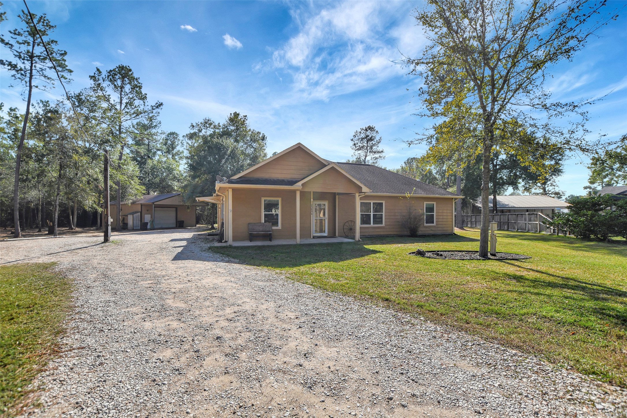 Country feel but close to city ammenities! Peaceful setting, three bedroom home on 2-acre cul-d-sac lot. Two horses are permitted on this property. 30x40 metal building with 10x30 overhang. The workshop has lots of loft space, room for your cars or other equipment and a cedar "mancave". Island kitchen is open to the den and has ample storage solutions; refrigerator stays. Split bedroom plan. Primary suite has 2 closets, dual sinks and the tub/shower combination has a soaking tub. Vinyl plank flooring in wet rooms and living areas. Only carpet is in the bedrooms. Recent cedar enclosed patio out back with handmade cedar bar surround. There is a fenced-in area for your pets. Sprinklers located throughout the property. This home is convenient to FM 1488, Aggie Expressway, which takes you to Tomball or College Station. Low tax rate. Subdivision has a community pool, tennis courts, lakes and 2 pavilions! Motivated sellers!