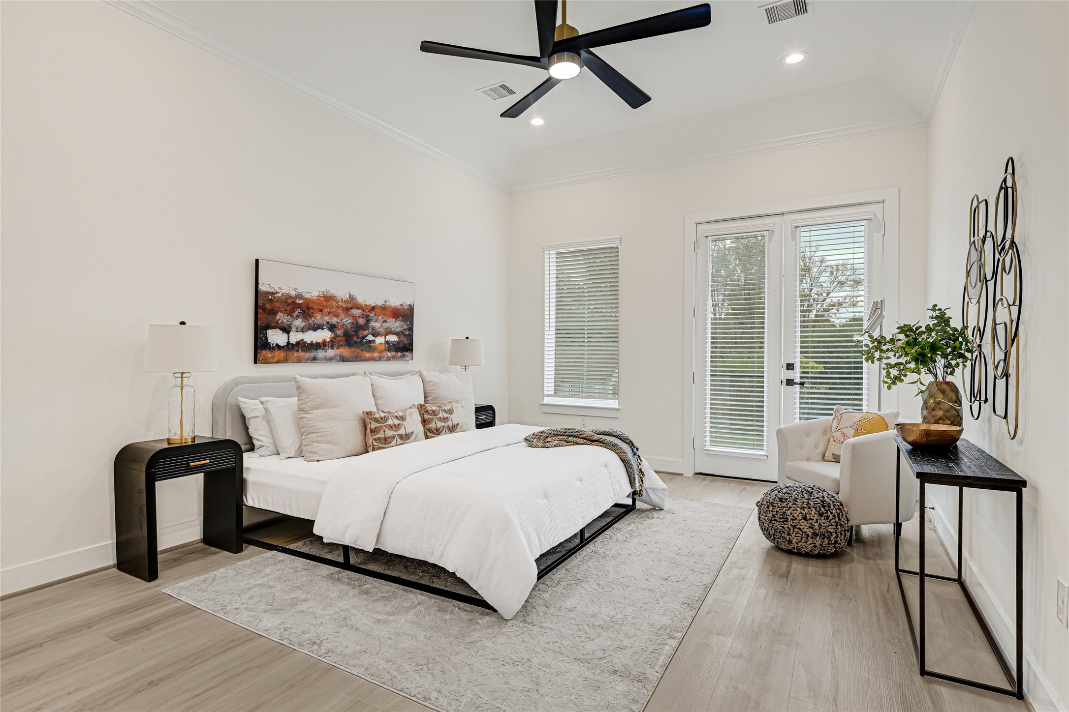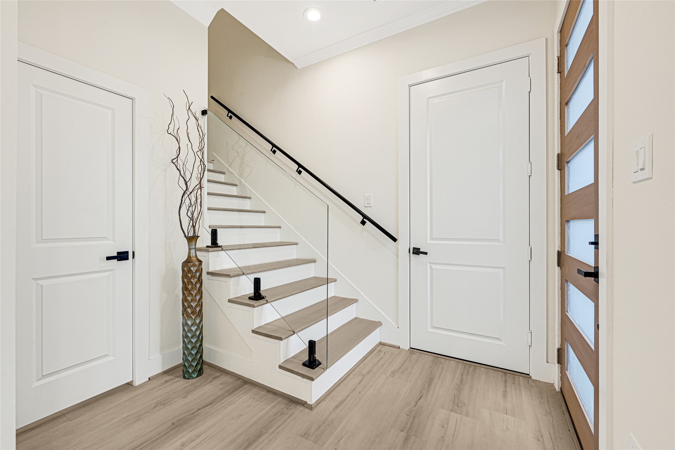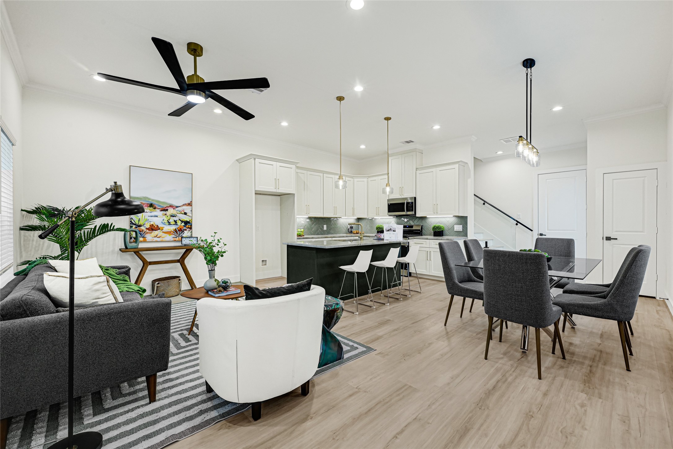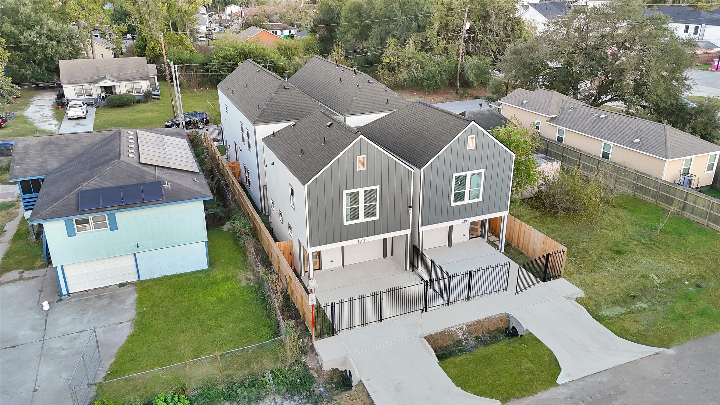 Welcome to this versatile multi-family property featuring a main home and an accessory/additional Dwelling Unit (ADU) on the same lot with separate entrances. The main residence faces east (front door faces north) and includes a 2-car garage. Interior features a natural palette with elegant gold accents and a modern frameless glass railing. The ADU is located back-to-back with the main home, facing west, and includes a 1-car garage. Entry opens to a mud area with stairs leading to a 564 sq. ft. apartment featuring a full-size kitchen with a solid wood butcher block countertops, window coverings, and Two Gated entries. Ideal for multi-generational living or investment, this property offers flexibility, privacy, and modern design throughout.