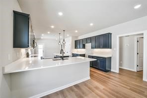 Welcome home to one of the community’s most sought-after floorplans. This impressive one-story, four-bedroom, two-bathroom residence combines modern style with an open, functional layout designed for everyday living and effortless entertaining. At the heart of the home, the kitchen truly stands out with a massive island and a generous peninsula, offering unmatched workspace, storage, and versatility. Whether you’re cooking, gathering, or hosting, this dream kitchen elevates every moment. The private primary suite offers a spacious retreat featuring a well-appointed bathroom with dual sinks and an expansive walk-in closet. Throughout the home, sleek matte black fixtures and recessed lighting create a clean, modern aesthetic. Step outside to a large, covered patio, perfect for unwinding while taking in the peaceful, nature-filled surroundings. Visti DSLD Homes and schedule your showings TODAY!!! Photos are REPRESENTATIVE!!!