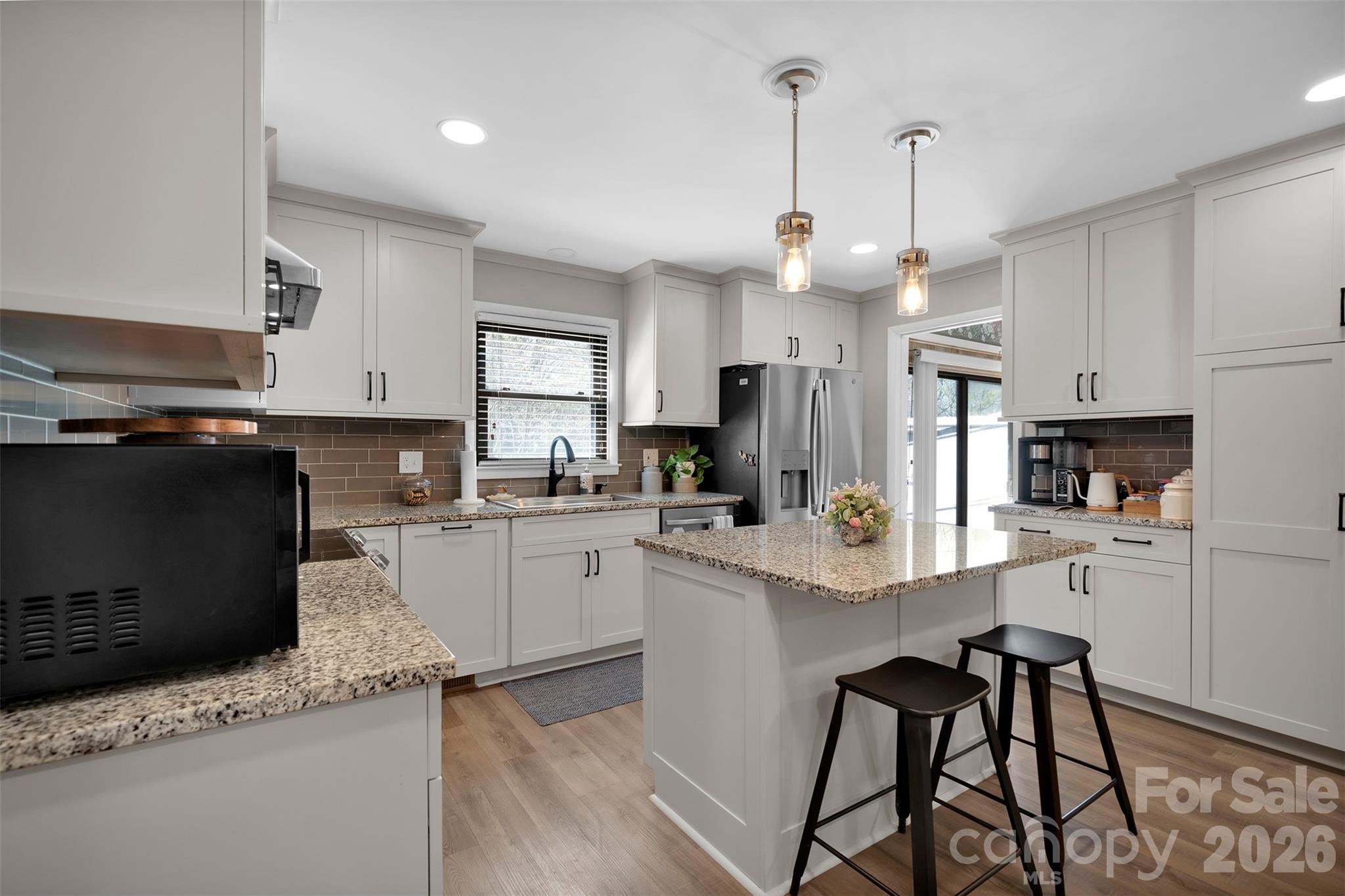 Looking for a ranch home in an established neighborhood with a half acre lot? Stop the car! Full Brick....Complete Kitchen remodel w/ custom Cabinets, granite, Bar stool Island, & subway tile backsplash. Brand New Fridge Included! LVP thru-out most of home & Freshly Painted! Additional features incl soft close drawers & Cab, built-in shelves / desk, board & batten wall accents, upgraded bathrooms, stove fireplace insert, whole house attic fan, Titanium re-enforced Entry Doors, solid wood interior doors, crown molding, & more. The Sun/Bonus Room add-on gives you lots of fun family gathering space.....great for a Rec room. The air compressor, tools, and two freezers in the back section of garage stay with the house! Attic has tons of flooring for storage. Outside, you'll find a sturdy 10 x 12 powered workshop shed, a fenced yard, 3 fig trees, & garden beds. Convenient West Charlotte location......minutes from I-485, 7 min to the airport, & about 20 min to Uptown. No HOA!