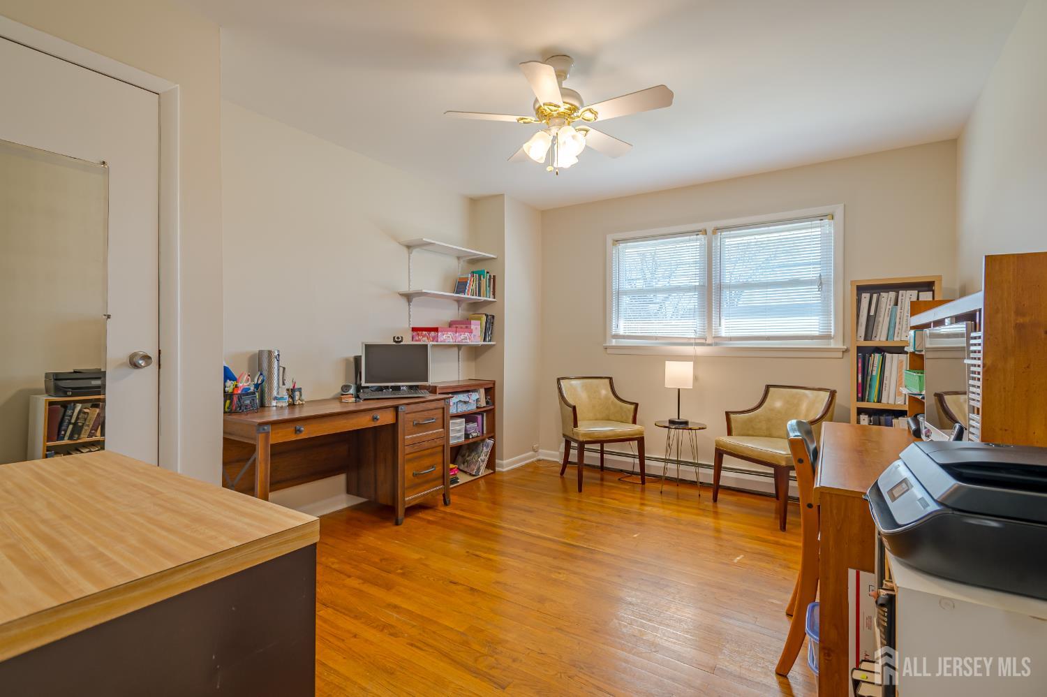 Due to multiple bidding best offers are requested by Tuesday March 17 at 12:00pm. Situated on a desirable, sprawling lot, this beautifully updated Ranch home welcomes you with freshly painted sunlit interiors, timeless charm, and thoughtful improvements throughout! An attractive paver stone walkway leads to classic brick steps and a front door with a decorative glass inlay. Gorgeous hardwood flooring flows seamlessly from the living room into the dining area, creating a warm, cohesive atmosphere. The generous size living room is bathed in natural light from a large bay window and features an electric fireplace framed by a richly detailed wood surround and mantlean inviting centerpiece for relaxing evenings or entertaining guests. The dining room overlooks the backyard, offering a bright, cheerful setting for daily meals as well as special gatherings. The eat-in kitchen blends style with practicality, boasting handsome cabinetry with plenty of storage, a sink set beneath a window, and overhead lighting above the sink and stove that enhances the workspace. Additional amenities include a ceiling fan with lighting, gas range, dishwasher, brand-new stainless steel refrigerator, recessed lights, and durable laminate wood flooring that adds both beauty and resilience. Conveniently located off the kitchen is access to the garage, basement, and a versatile bonus room featuring recessed lighting and laminate wood flooring that coordinates with the kitchen. A hallway leads to 3 comfortable bedrooms, each offering hardwood flooring, ceiling fans with lights, ample closets, and multiple windows that welcome sunlight throughout the day. The full bath presents a lovely pedestal sink, roomy shower with sliding glass doors, plus a handy linen closet for organization. The spacious unfinished basement offers an existing washer and dryer, several windows for natural light, and endless possibilities. Whether used for storage, a workshop, or eventual finishing, this level provides excellent flexibility. Step outside to enjoy the spacious backyard, bordered by a fence and featuring a storage shed for lawn equipment and seasonal items, ample space for recreation, gardening, or simply unwinding in the fresh air. This property is located close to NYC trains/buses, restaurants, shopping, Rutgers University and RWJ University hospital. *** Please note only 1 shed will remain on the property***