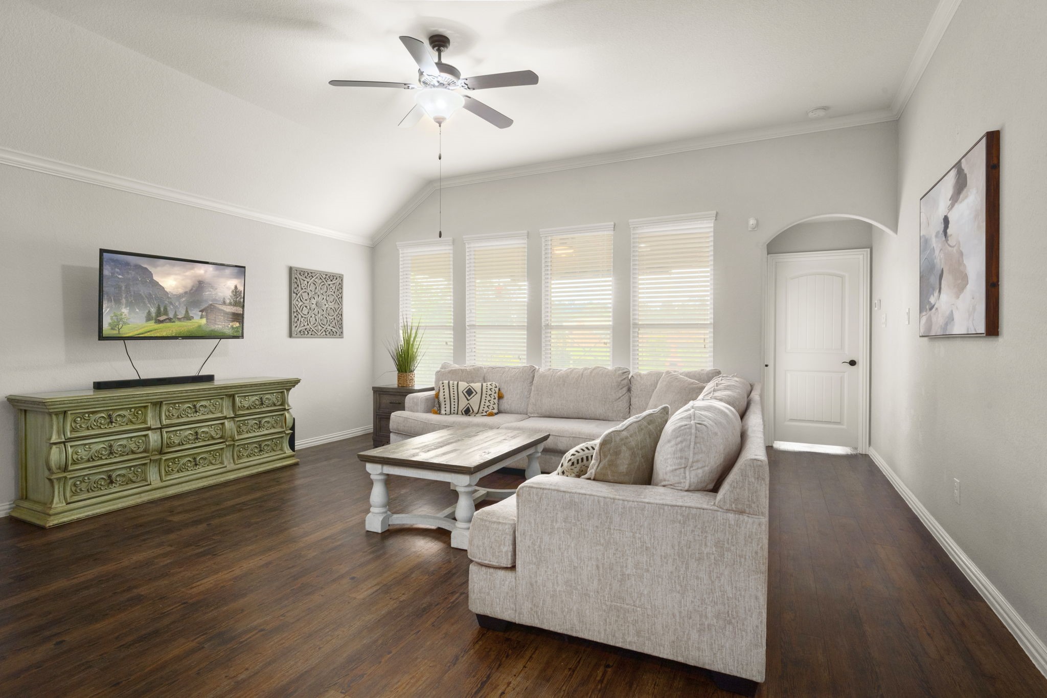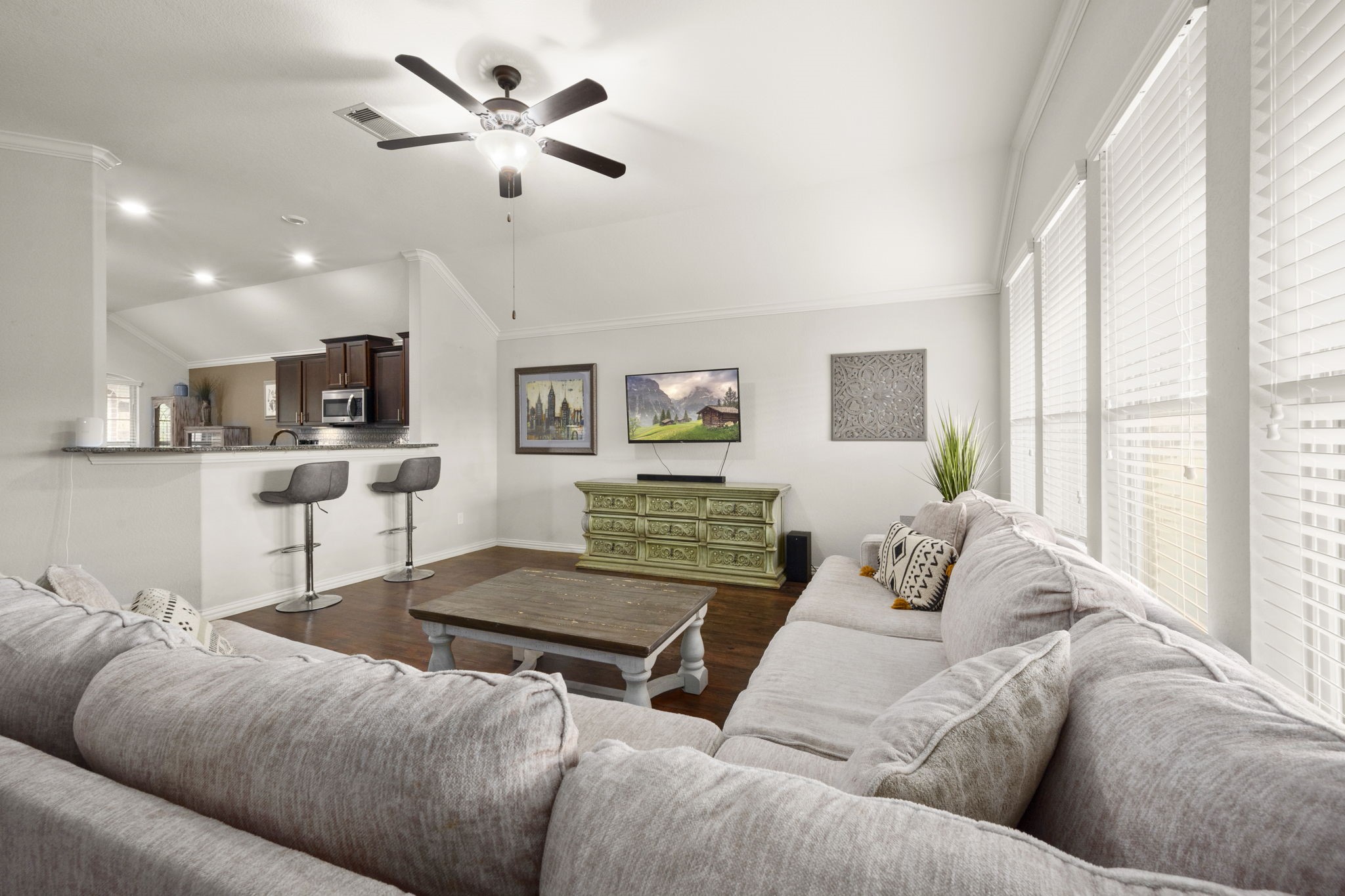 Immaculate single-story loaded with upgrades—from the custom front door to high ceilings throughout, crown molding, and luxury vinyl wood-look floors. Bright, open layout with a stunning kitchen featuring granite, stainless steel appliances, 5-burner stove, island, breakfast bar, and walk-in pantry—all overlooking a spacious living area with a wall of windows. Private primary suite offers dual sinks, soaking tub, separate shower, and a large walk-in closet. Two additional bedrooms with a full bath. Enjoy a fully landscaped backyard, fruit trees, covered patio and mature trees. Extras include a sprinkler system and double gate access! A short drive to Lake Conroe and The Woodlands! Schedule your viewing today!