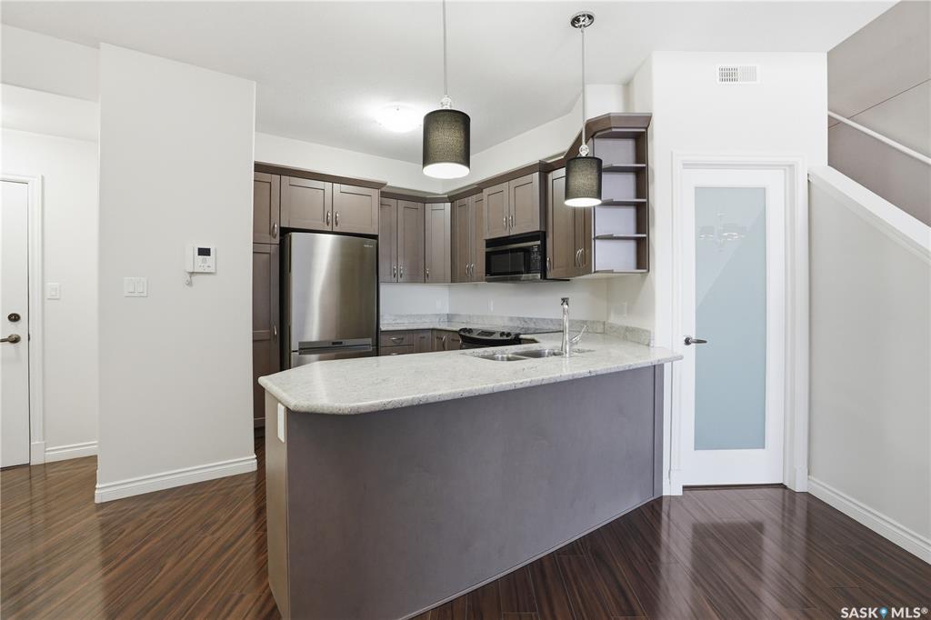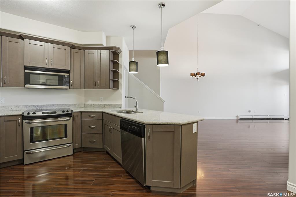 Top-Floor Loft Condo in Greystone Heights 2 Underground Parking Stalls!Welcome to 301-2730 Main Street, a spacious top-floor residence in the heart of desirable Greystone Heights. This unique condo showcases a rare loft-style layout, two underground parking stalls (Stalls 45 & 47), and storage unit (47)a true standout in this sought-after community. The main floor features a bright and functional kitchen, complete with granite countertops, peninsula seating, and included appliances: fridge, stove, dishwasher, and over-the-range microwave. The open-concept dining and living area is enhanced by a northwest-facing window and a garden door that leads to a private balconyperfect for relaxing and enjoying summer evenings. A den with a glass-insert door offers an ideal space for a home office or hobby room. Also on the main level is a generously sized second bedroom, a 4-piece bathroom, and a convenient laundry/storage room with washer and dryer included. Upstairs, the primary suite presents a distinctive open-to-below design overlooking the main living space, along with a 3-piece ensuite and a cozy sitting or office areaperfect for working from home or unwinding with a good book. Ideally located just steps from Greystone School and park, and with easy access to 8th Street, the University, College Drive, and Circle Drive, this home offers an exceptional blend of comfort, convenience, and style.