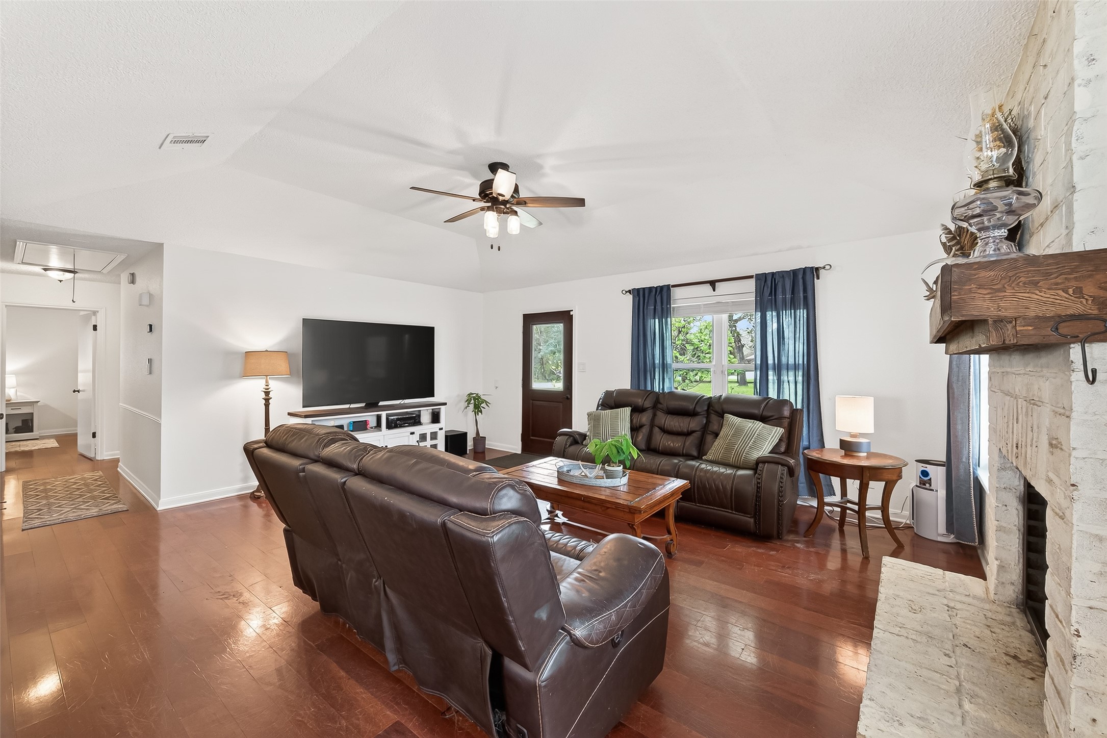 Rare opportunity to enjoy acreage living near city conveniences. Charming 3-bedroom, 2-bath brick home on 1.2 acres, tucked at the end of a quiet street in a wooded subdivision. Surrounded by mature trees and private lots, this well-maintained 1982 home offers peaceful, natural surroundings.Fresh interior paint, stylish finishes, and a cozy wood-burning fireplace create a warm, inviting space. The property includes a detached 2-car garage and a versatile freestanding flex space with private office and large open area—ideal for a guest suite, studio, gym, or media room.Relax or entertain on the covered back patio. The fully fenced yard features a gravel drive, mature fig tree, and charming ranch-style stock tank pool.Roof (2025), septic tank inspected (2026), updated vinyl double-glazed windows (2020), 50 amp breaker for a camper, and wired for a backup emergency generator.